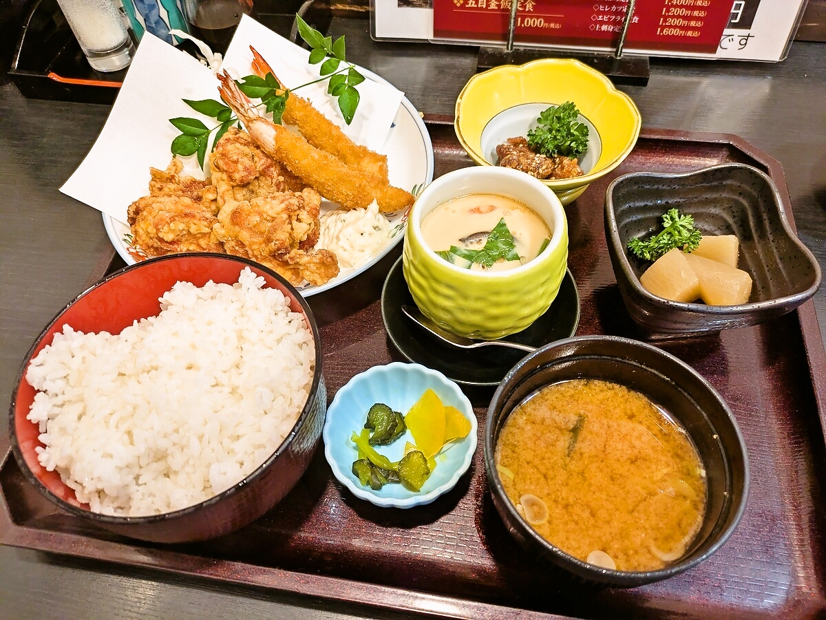 「海老・からあげ定食」は揚げ物は丁寧に揚げられていて、衣の食感・素材の旨味ともにバランスがよい