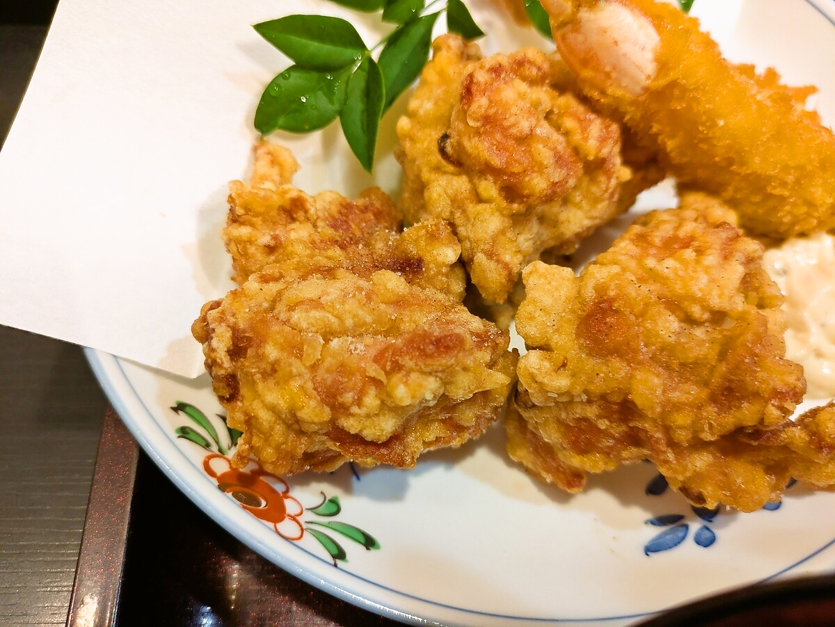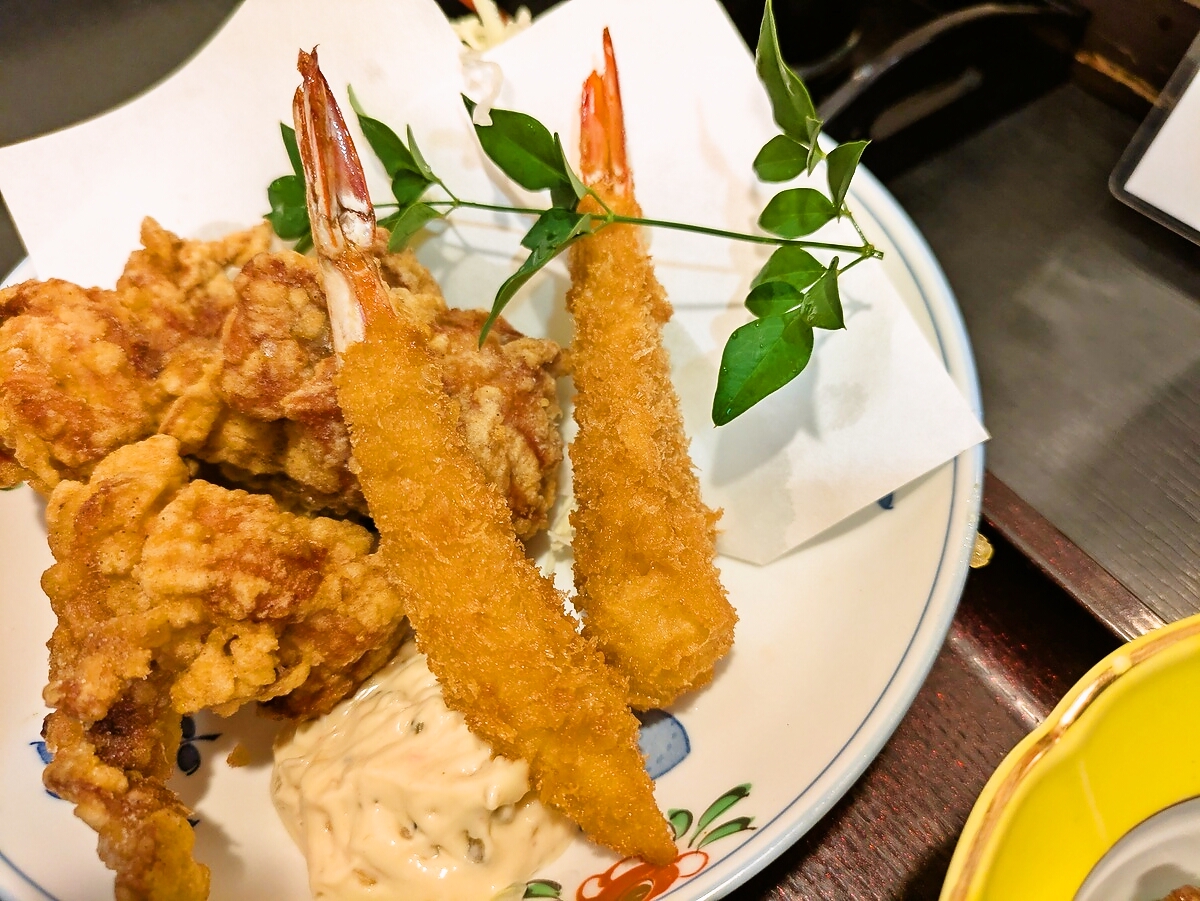 エビフライとからあげが一緒に盛られたお皿が和食の雰囲気を醸し出す