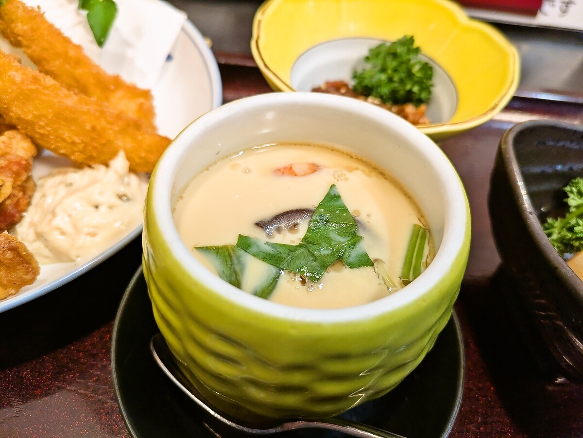 茶碗蒸しは具材豊富で、海老、鶏肉、きのこ、三つ葉などが入っている