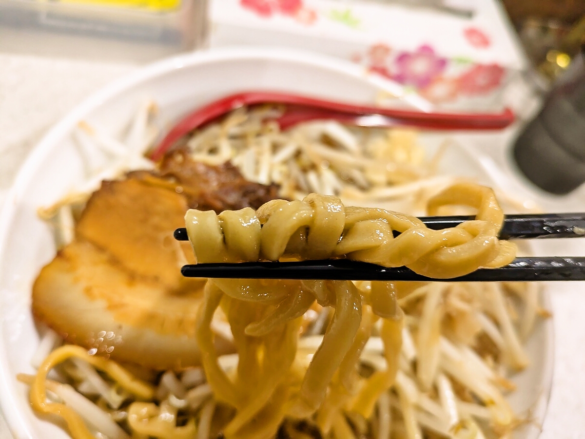麺は太麺でモチモチ食感、もやしはシャキシャキでボリューム満点