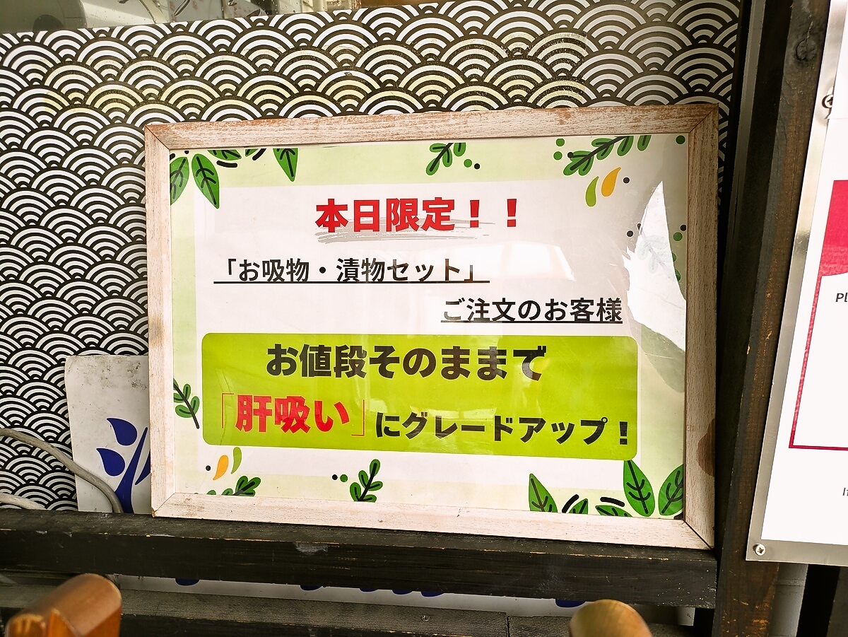 今日は「吸い物・漬物セット」がお値段そのままで「肝吸い」にグレードアップ