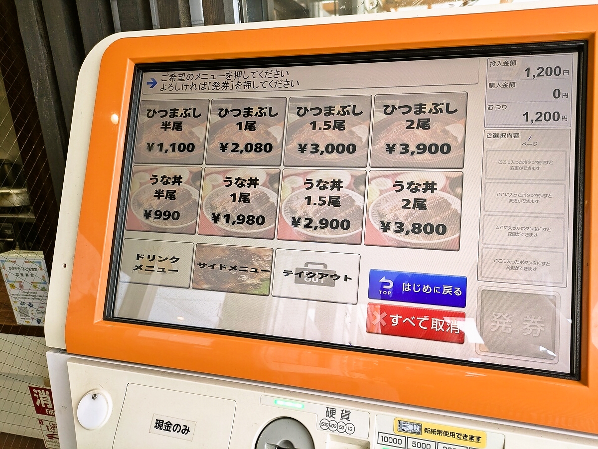 「うな丼半尾」にタッチの後「吸い物・漬物セット」にタッチ