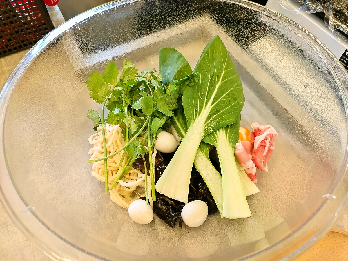 チンゲン菜の緑鮮やかさ、パクチーの香草感、キクラゲの黒いツヤ、牛肉の薄切りがスープに染まる様子が美しい