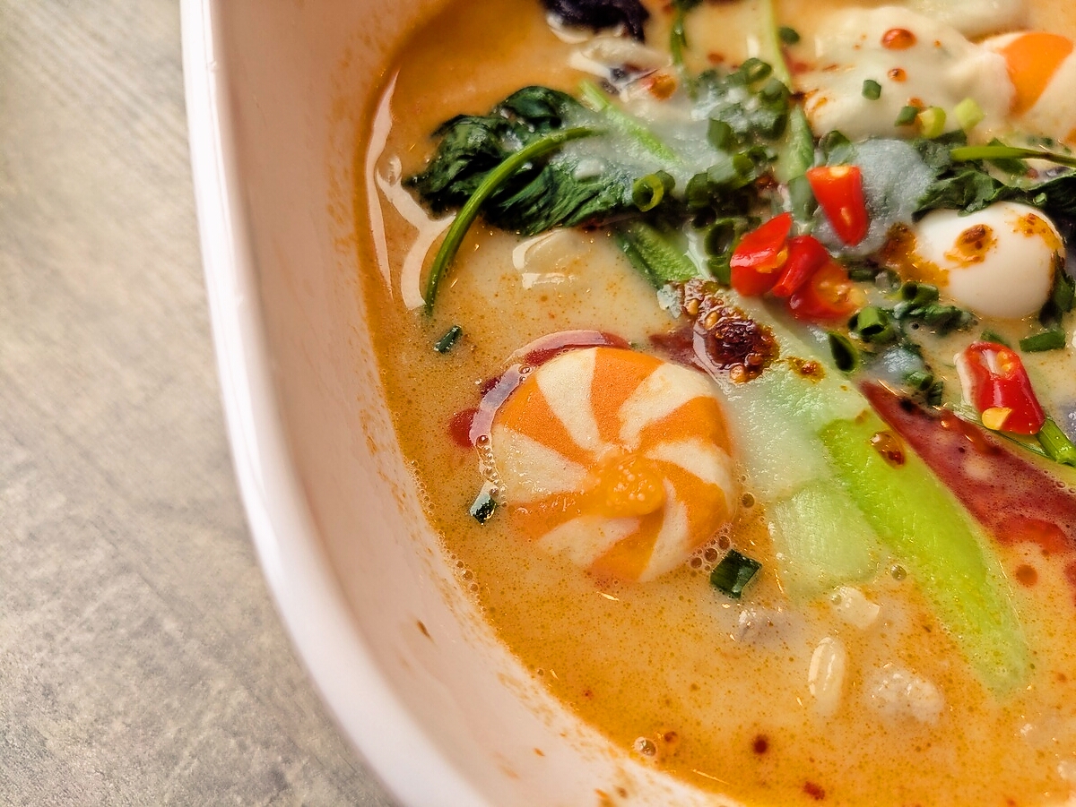うずら卵は黄身のまろやかさが辛さを中和し、パクチーは爽やかな風味をプラス