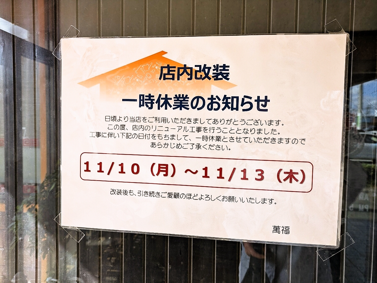11/10(月)から11/13(木)はリニューアル工事のため一時休業