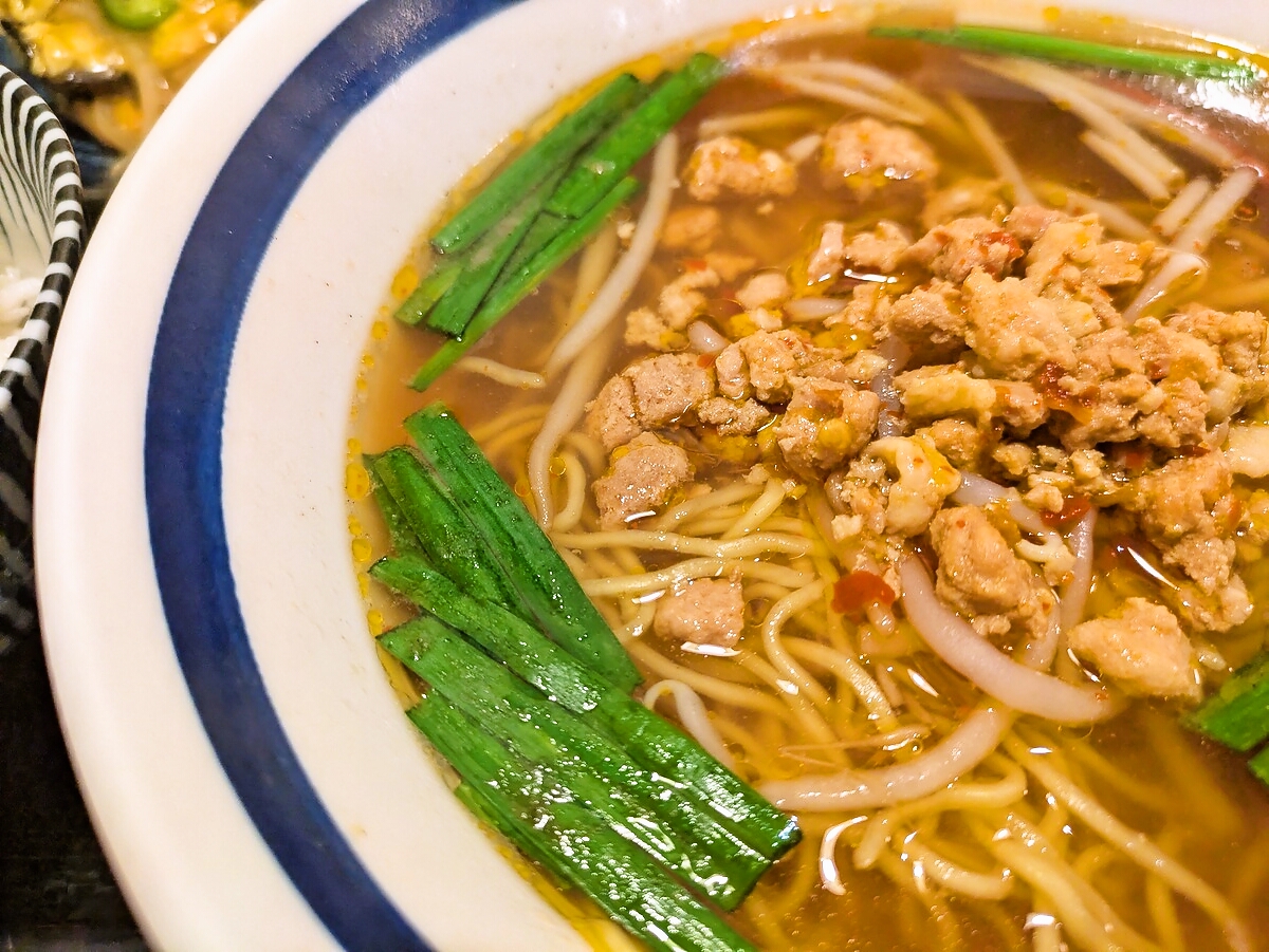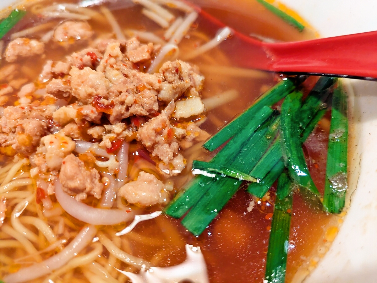 台湾ラーメンのスープは赤みがかった辛口で、唐辛子のピリッとした刺激が最初にやってくる