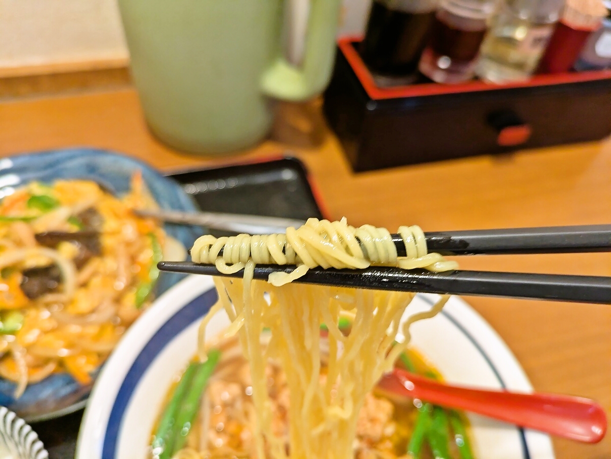 麺は細いストレートタイプで、弾力がありスープをよく絡む