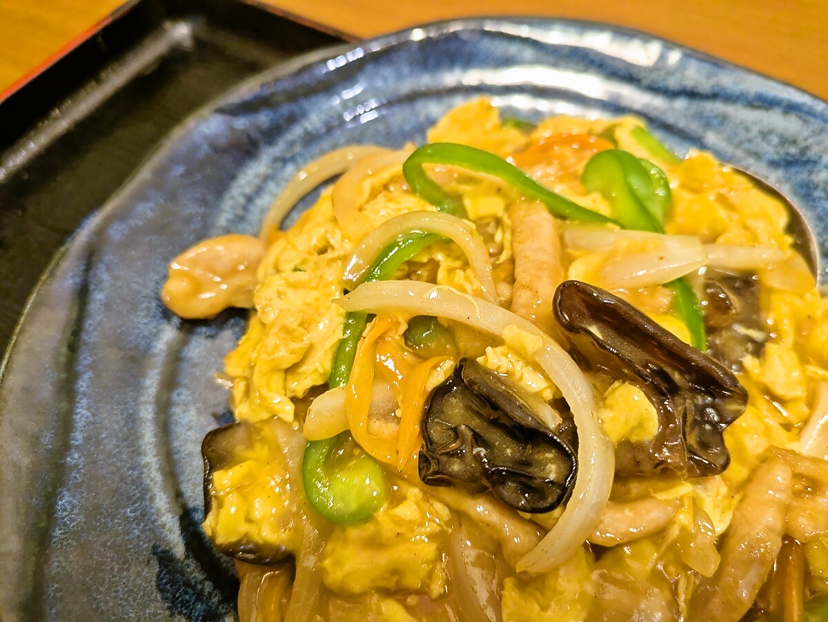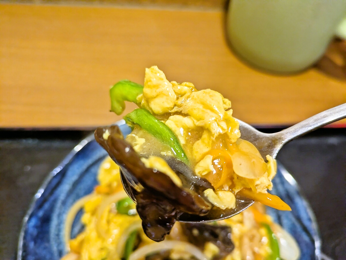 豚肉と玉子炒めには、キクラゲ、玉ねぎ、ピーマンなどの具材がたっぷり入っており、野菜の食感がアクセントになっている