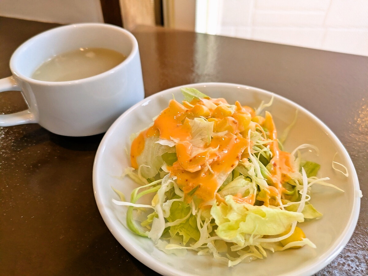 サラダのオレンジドレッシングはさっぱりとして、カレーの重さを軽減