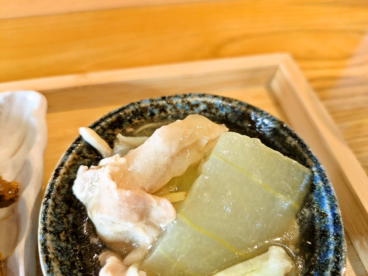 小鉢の冬瓜と豚肉の煮物は、冬瓜の透明感のある食感と豚肉の旨みが麹の優しい風味でまとめられ、ほっこり温まる一品