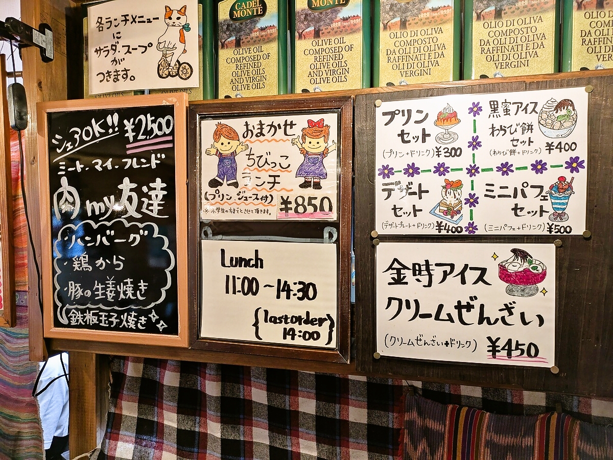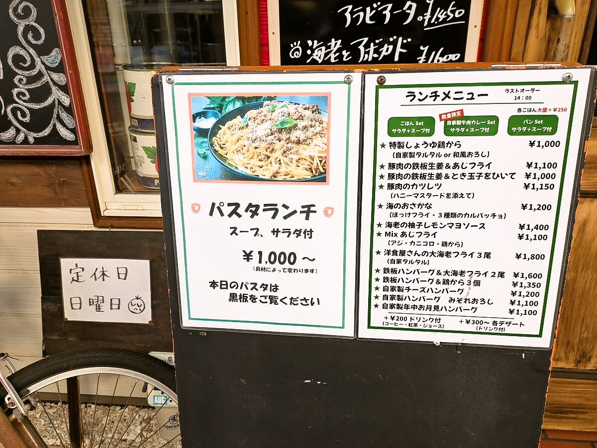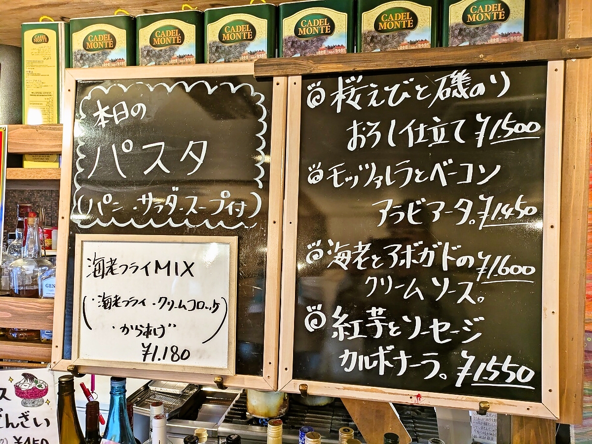 壁面に「日替わりパスタ」と「おすすめランチ」が掲示されている