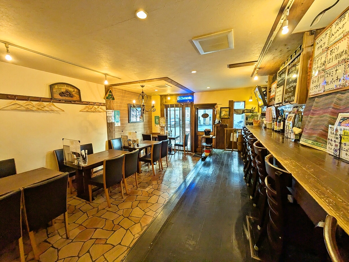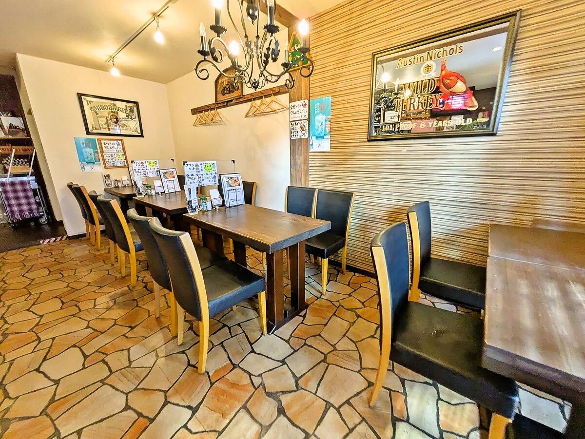 店内は木目調の落ち着いた空間で、カウンター席とテーブル席が用意されている