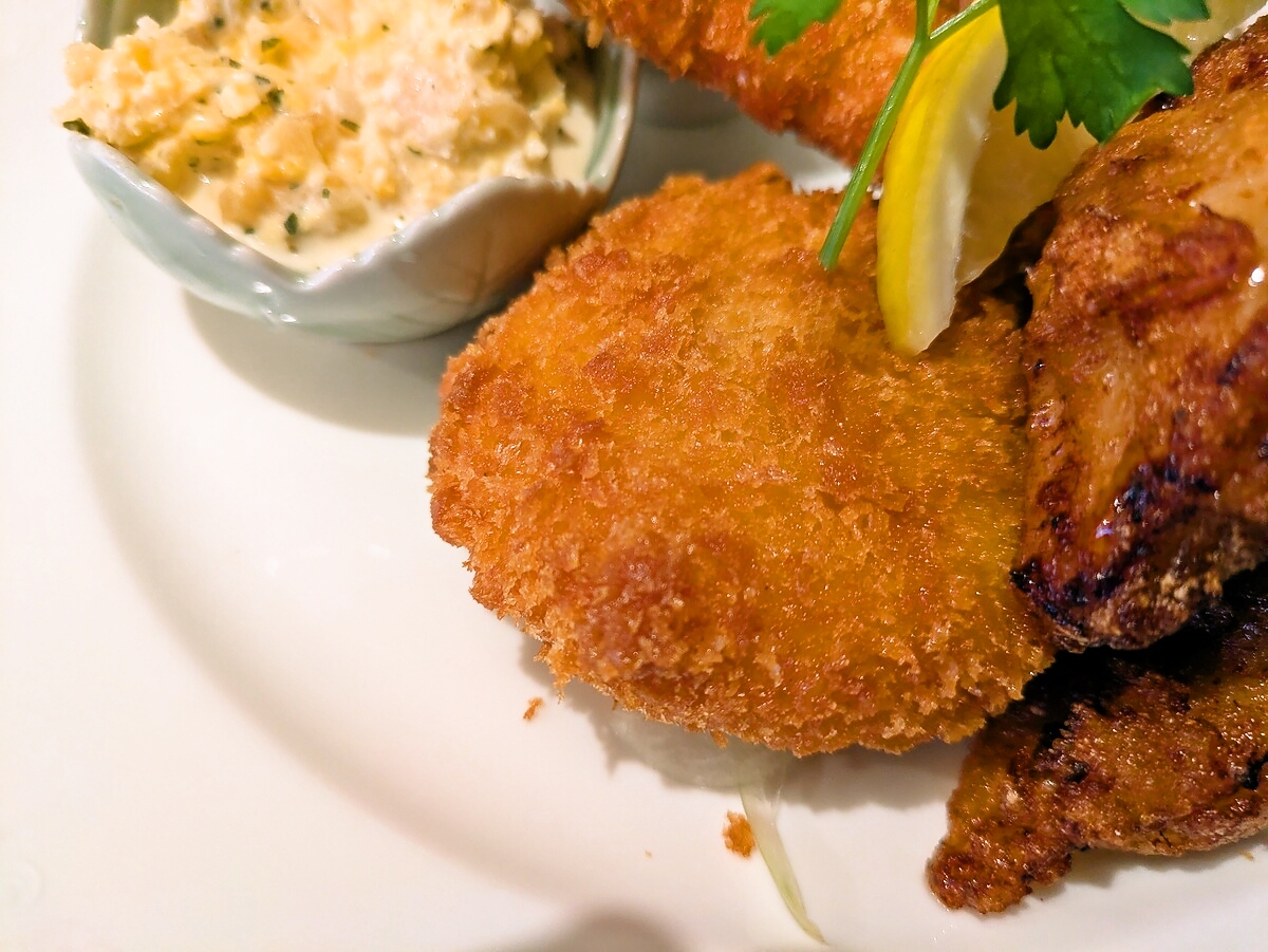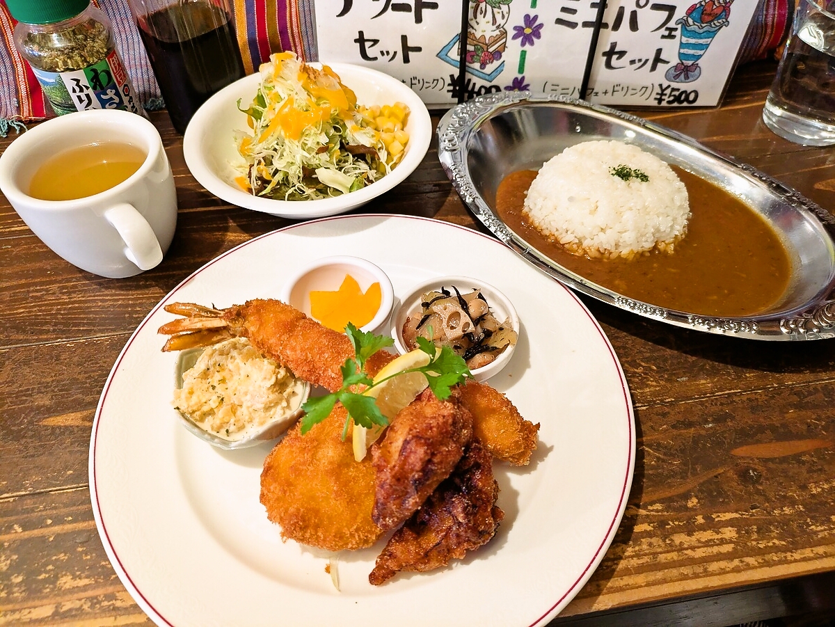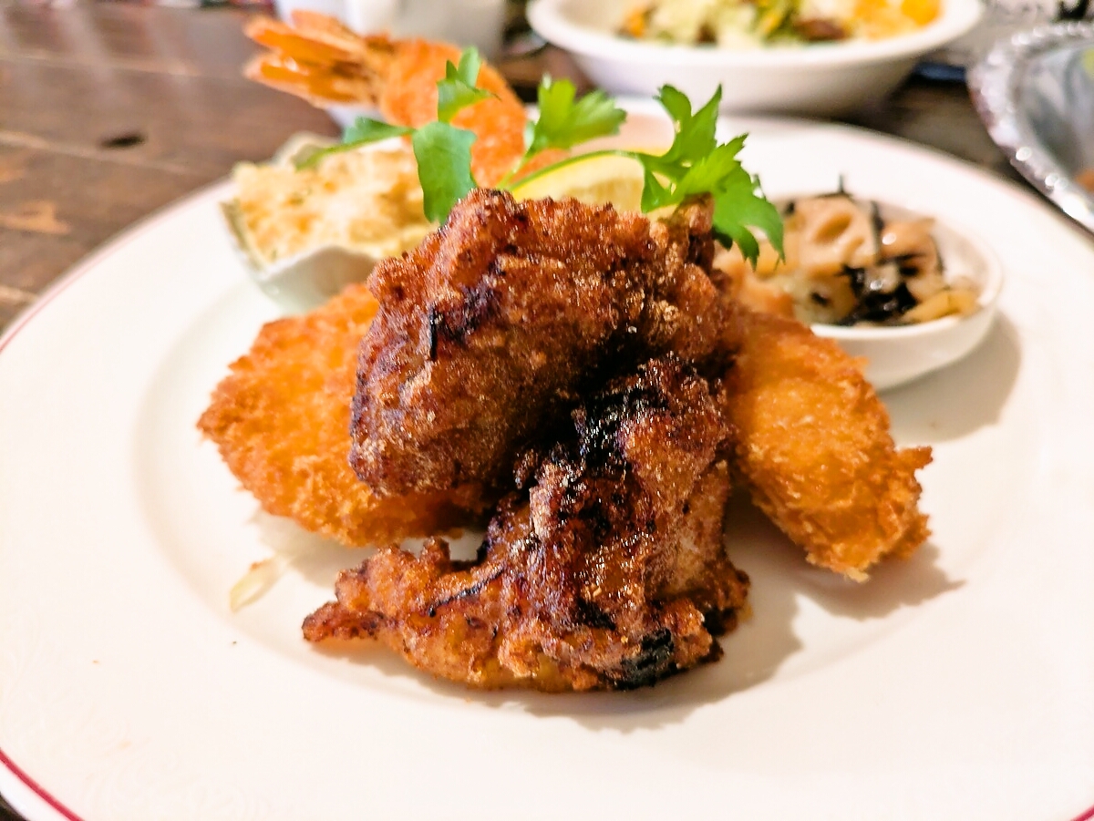 メインプレートには、サクッと揚がった海老フライ、とろりとクリーミーなクリームコロッケ、そしてジューシーなから揚げが並び、どれも揚げたての香ばしい香りが食欲を刺激する