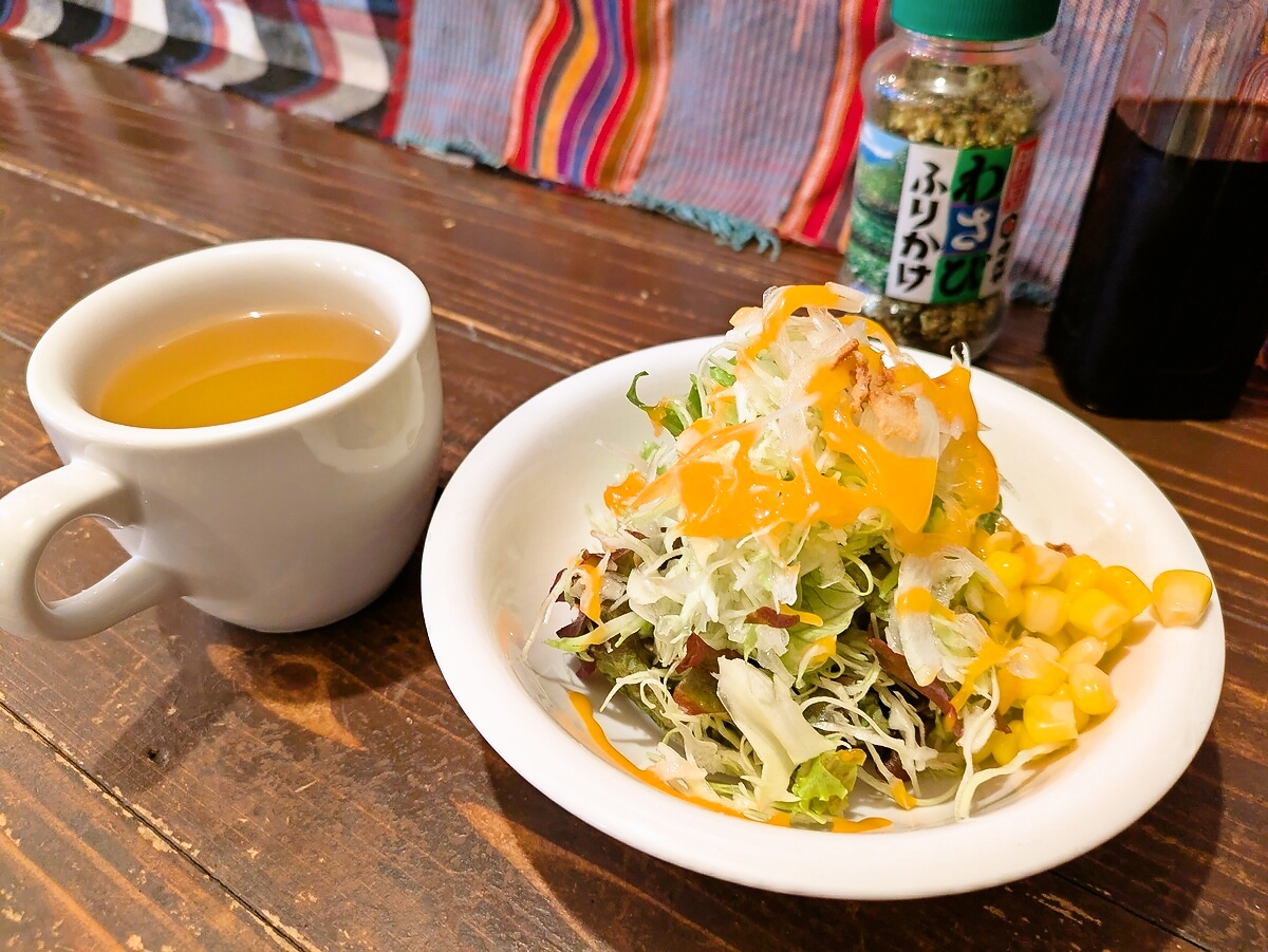 サラダはシャキシャキの新鮮野菜に爽やかなドレッシングがかかり、スープは優しい味わいで口をリセット