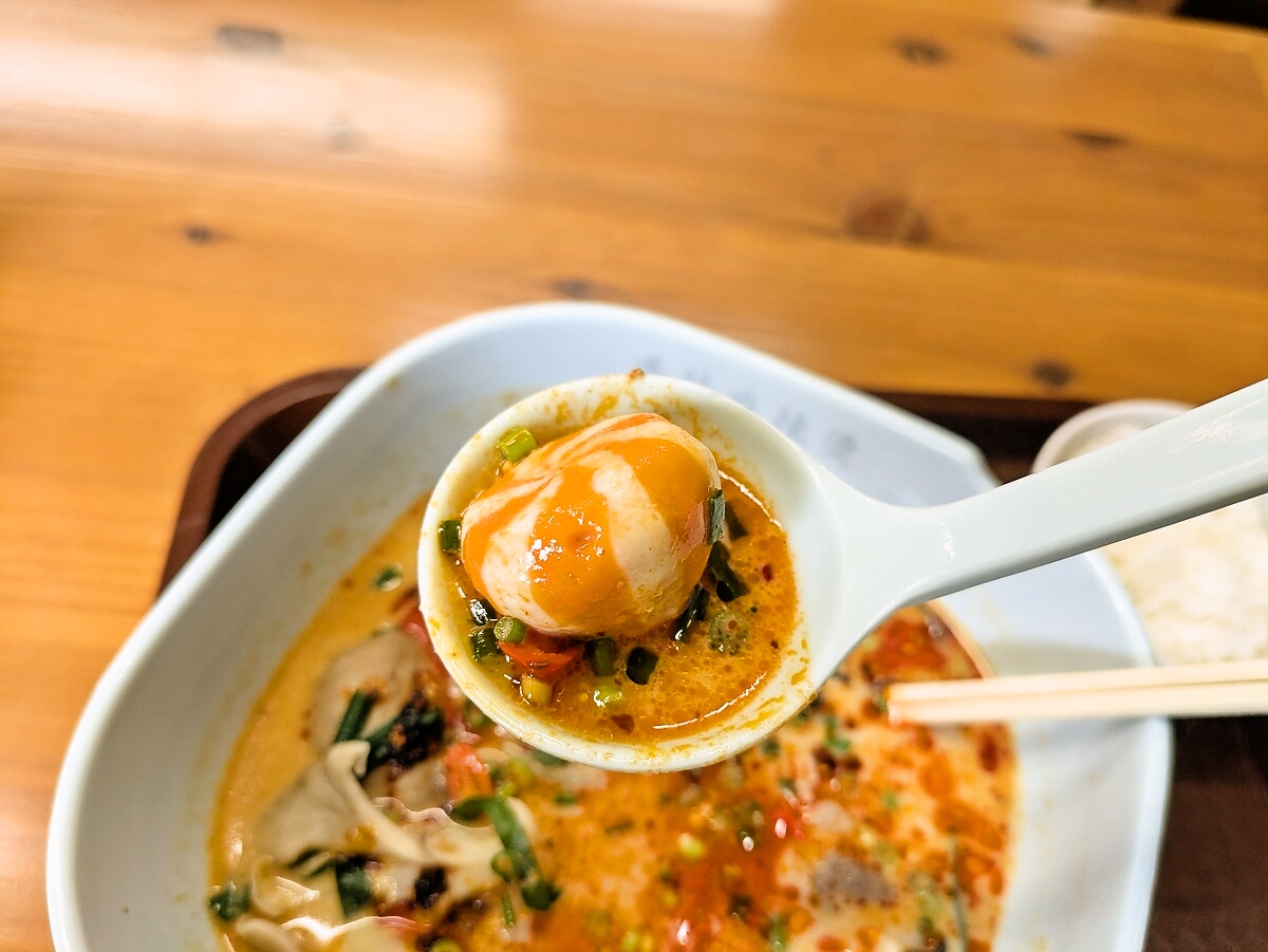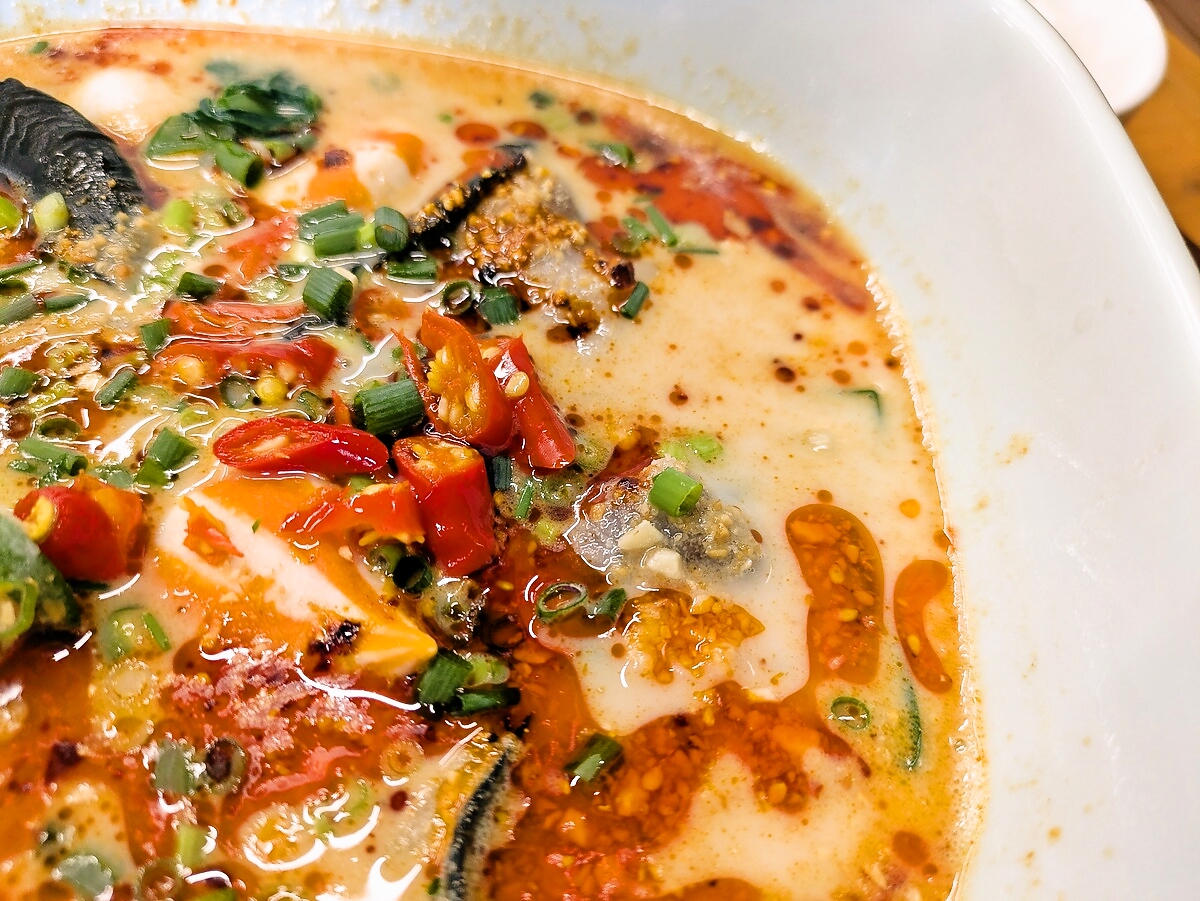 ボウルに盛られた一杯は、赤みがかったスープに具材がたっぷり沈み、視覚的にインパクト大