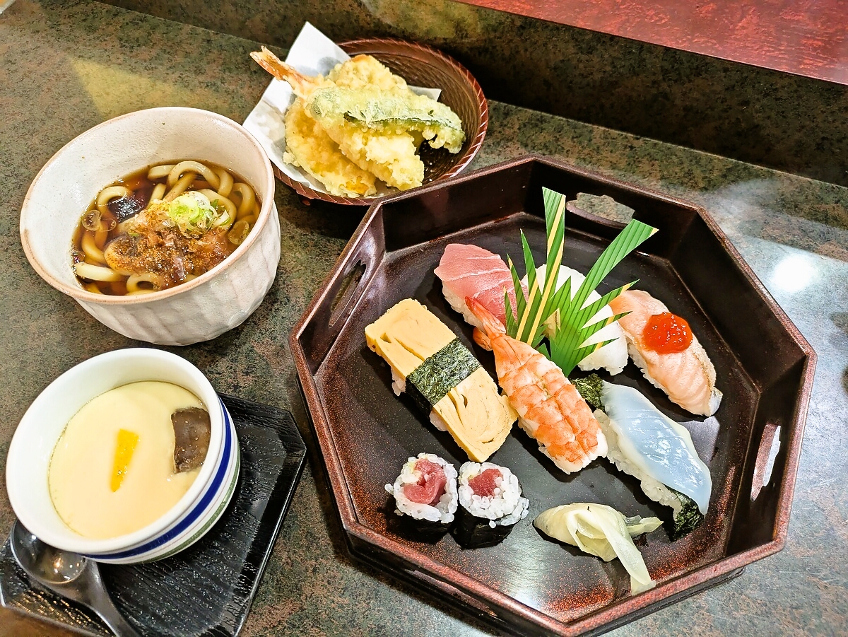 「にぎり」「天ぷら」「うどん」「茶碗蒸し」「デザート」が揃う、まさに“和食のフルコースを手軽に楽しむ”ランチ