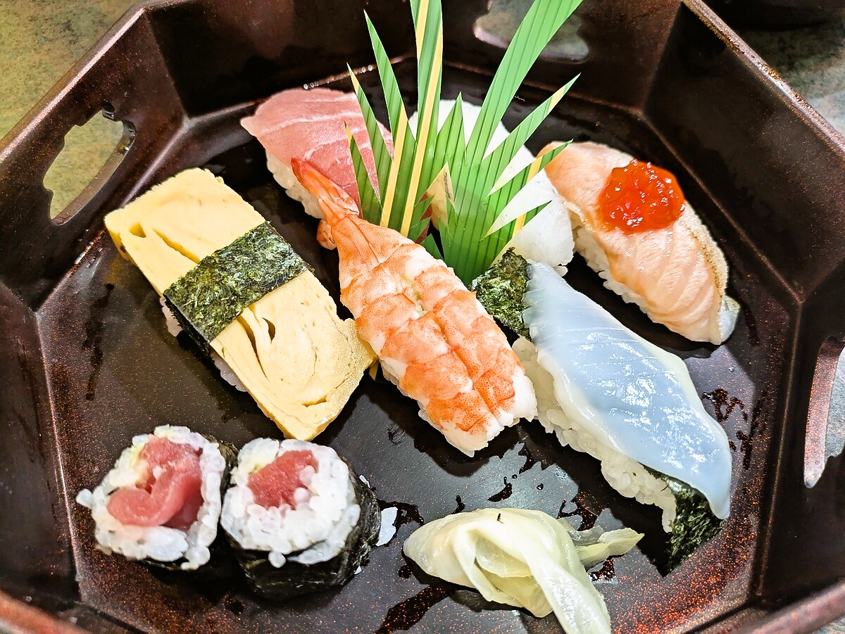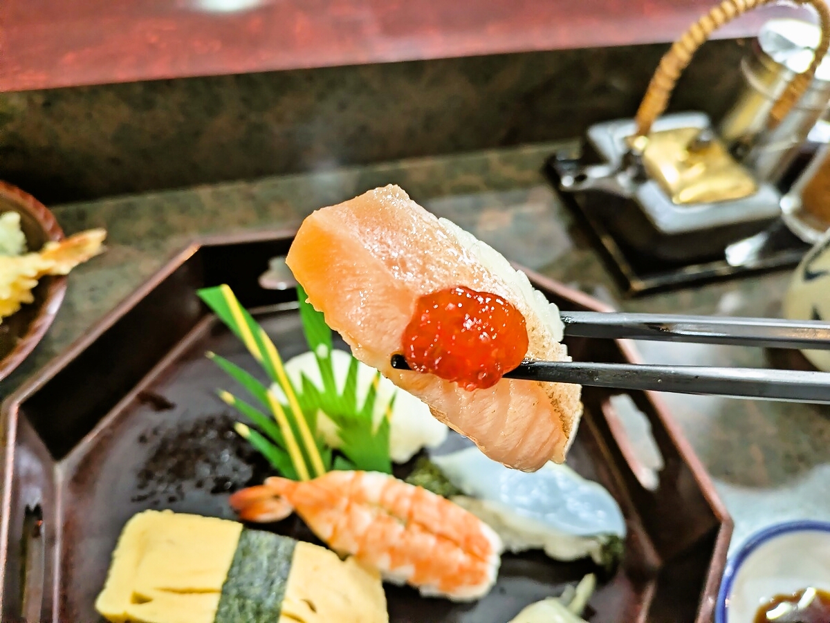 並んだ寿司は マグロ・サーモンいくら・イカ・鯛と、赤身から白身まで彩りも豊か