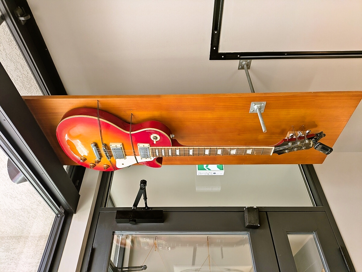 ドアの上にギターが飾られ、弦楽器の音が優しく迎えてくれるカフェのようなおしゃれな雰囲気