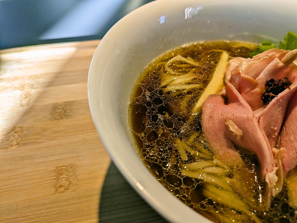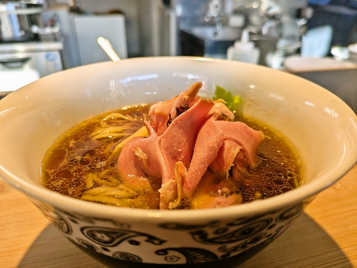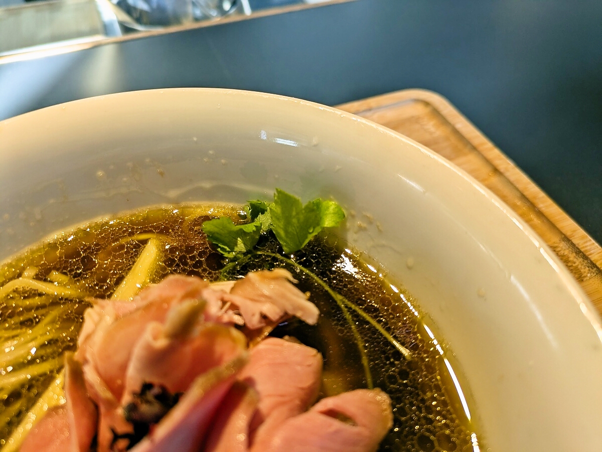 鶏清湯スープをベースにした一品で、大量の鶏を弱火で長時間炊き出し、丁寧にアクを取り除いた結果、雑味のない爽やかな味わいながらも圧倒的な出汁の厚みが感じられる