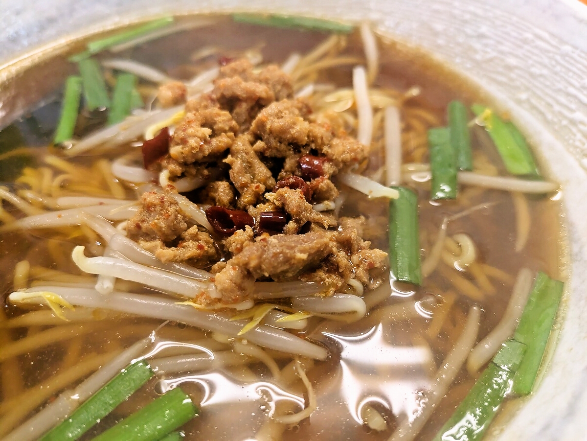 ニンニクと唐辛子、ひき肉の旨味をしっかりと持ち上げ、勢いよく啜るのが醍醐味