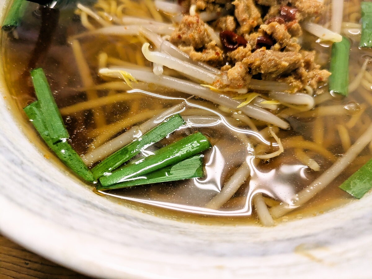 鶏ガラベースのあっさりとした醤油スープが、唐辛子とニンニクのパンチで一気に激変