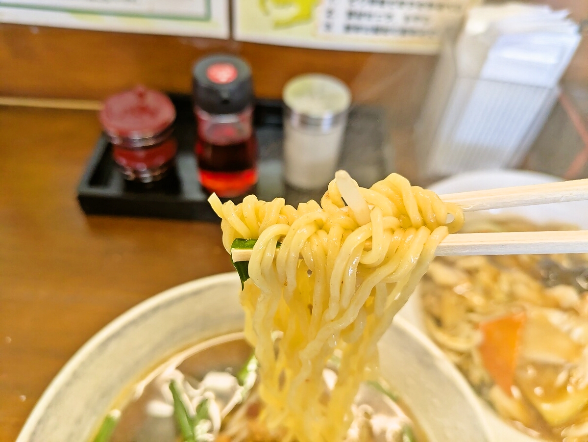 麺はコシがあり、熱々のスープの中でも最後までへたらない