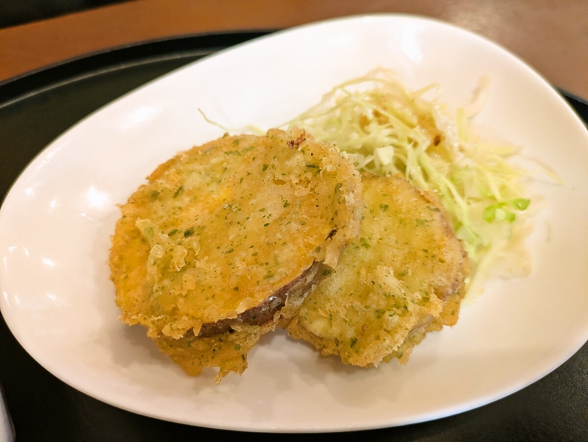 さつま芋の天ぷらはサクサクの衣にホクホクの芋の甘みが活きていて、季節感を感じさせる一品