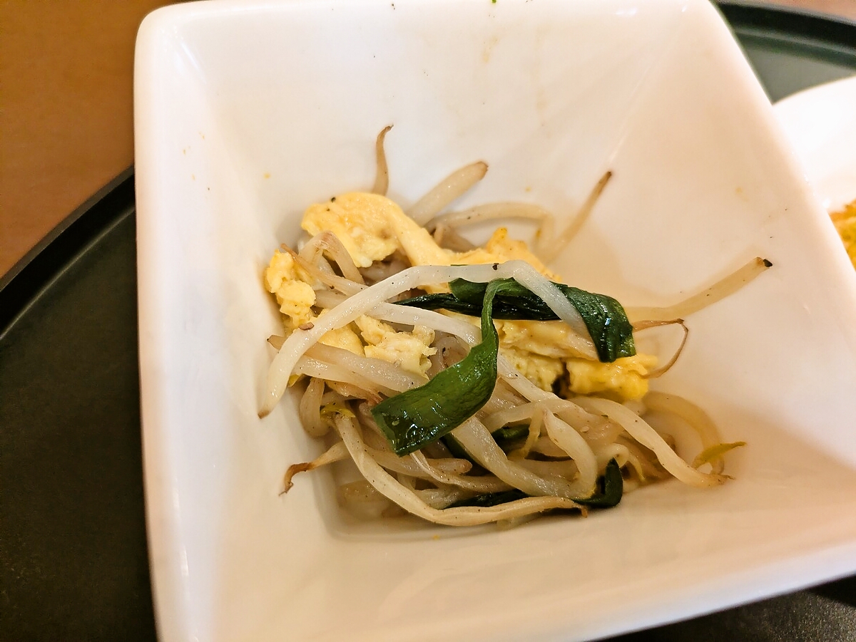 もやしとニラの玉子とじは、シャキシャキの野菜とふわふわの卵が絡み、ヘルシーながら満足感が高い