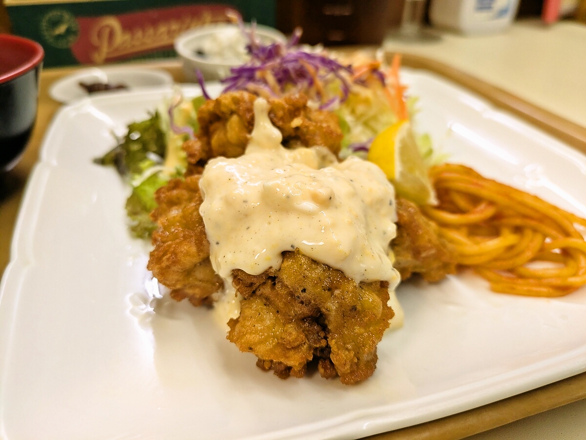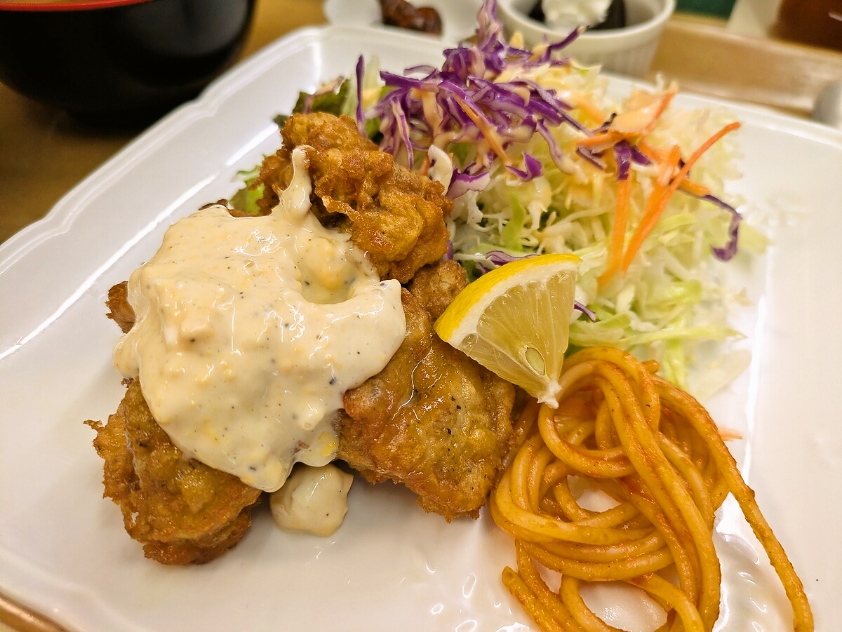 揚げたての唐揚げがゴロゴロと盛り付けられ、その上には自家製と思われるたっぷりのタルタルソースが惜しみなくかかっている
