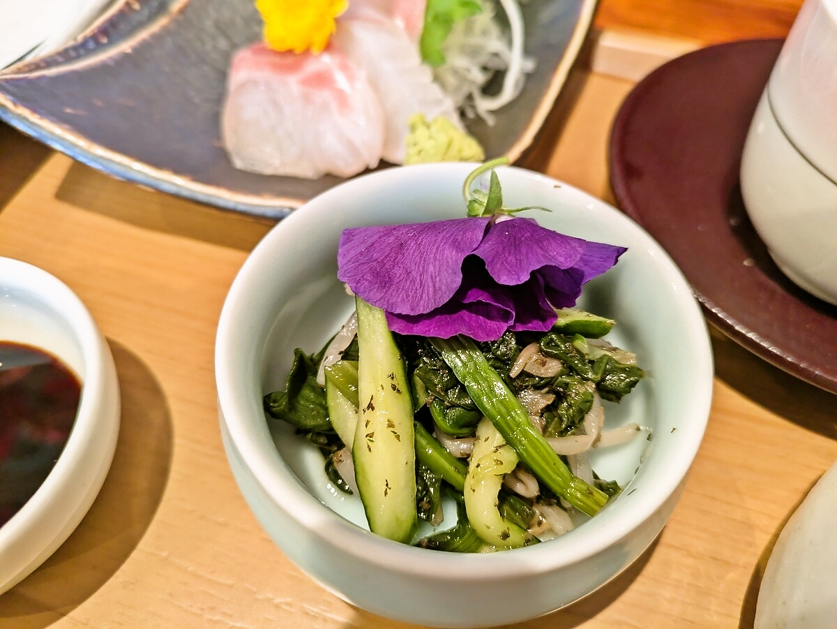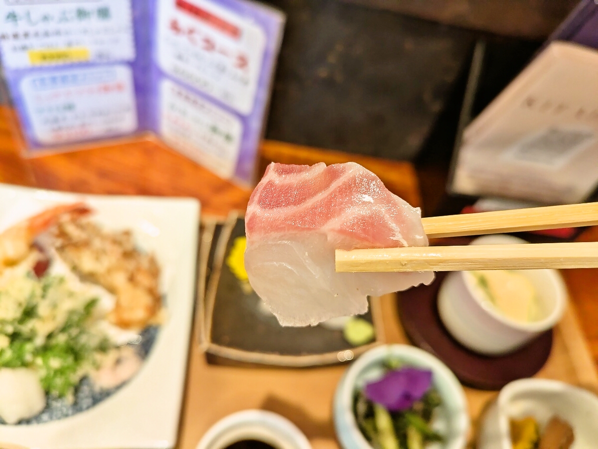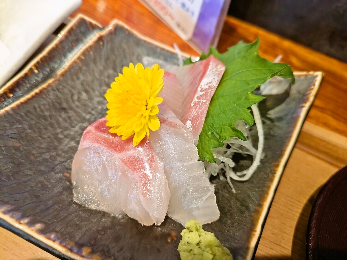 刺し身は新鮮なハマチが厚めに切られており、プリプリとした食感と甘みが際立つ