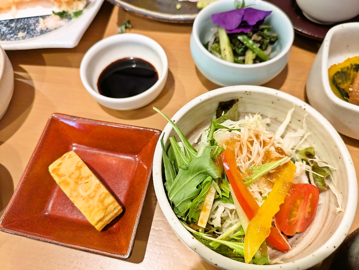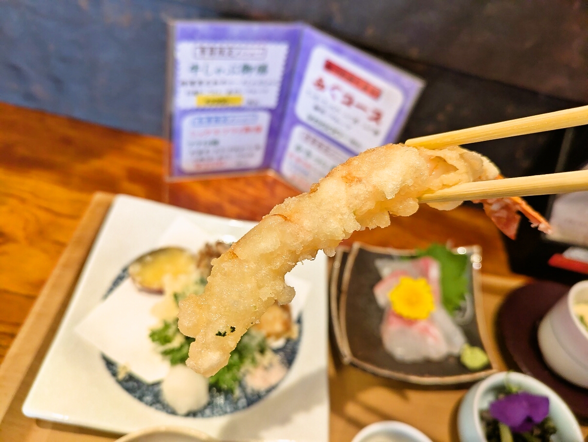 天ぷらはサクサクの衣が軽やかで、中のえびはジューシー、大葉の香りがアクセント