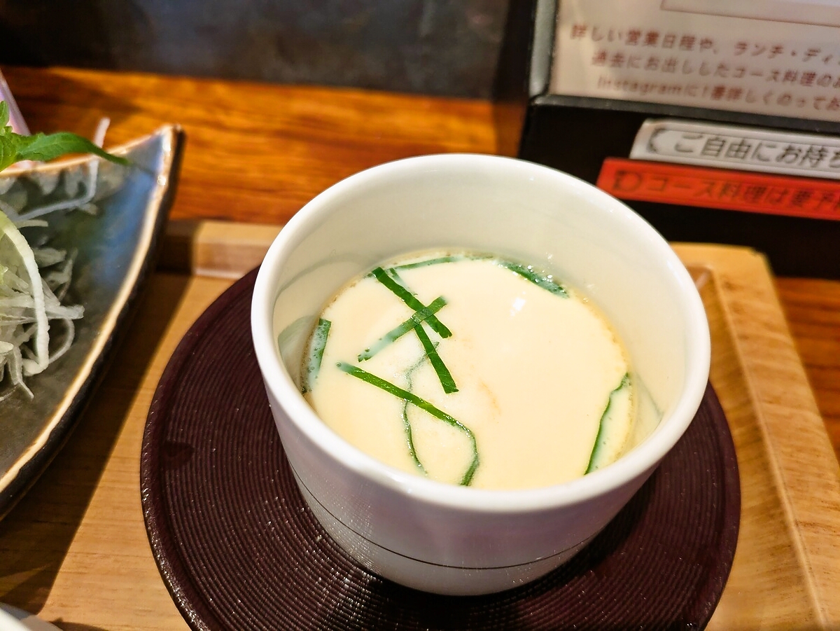 茶碗蒸しは滑らかな蒸し加減で、鶏肉やきのこが入った定番の味わい