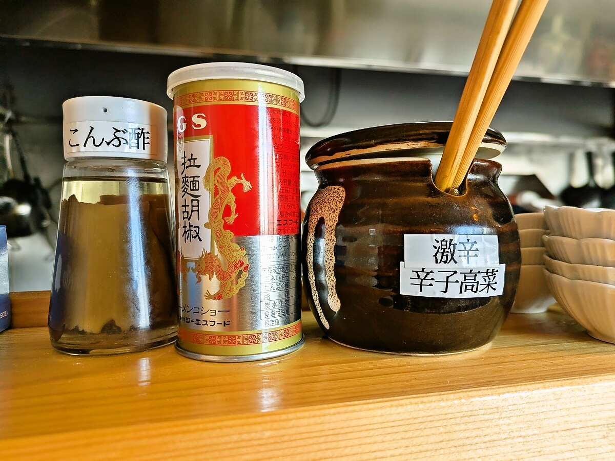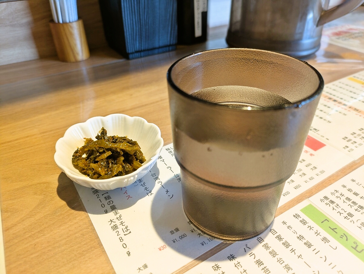 冷水と激辛辛子高菜をセルフ用意し、厨房の中を見て楽しみながら待つ