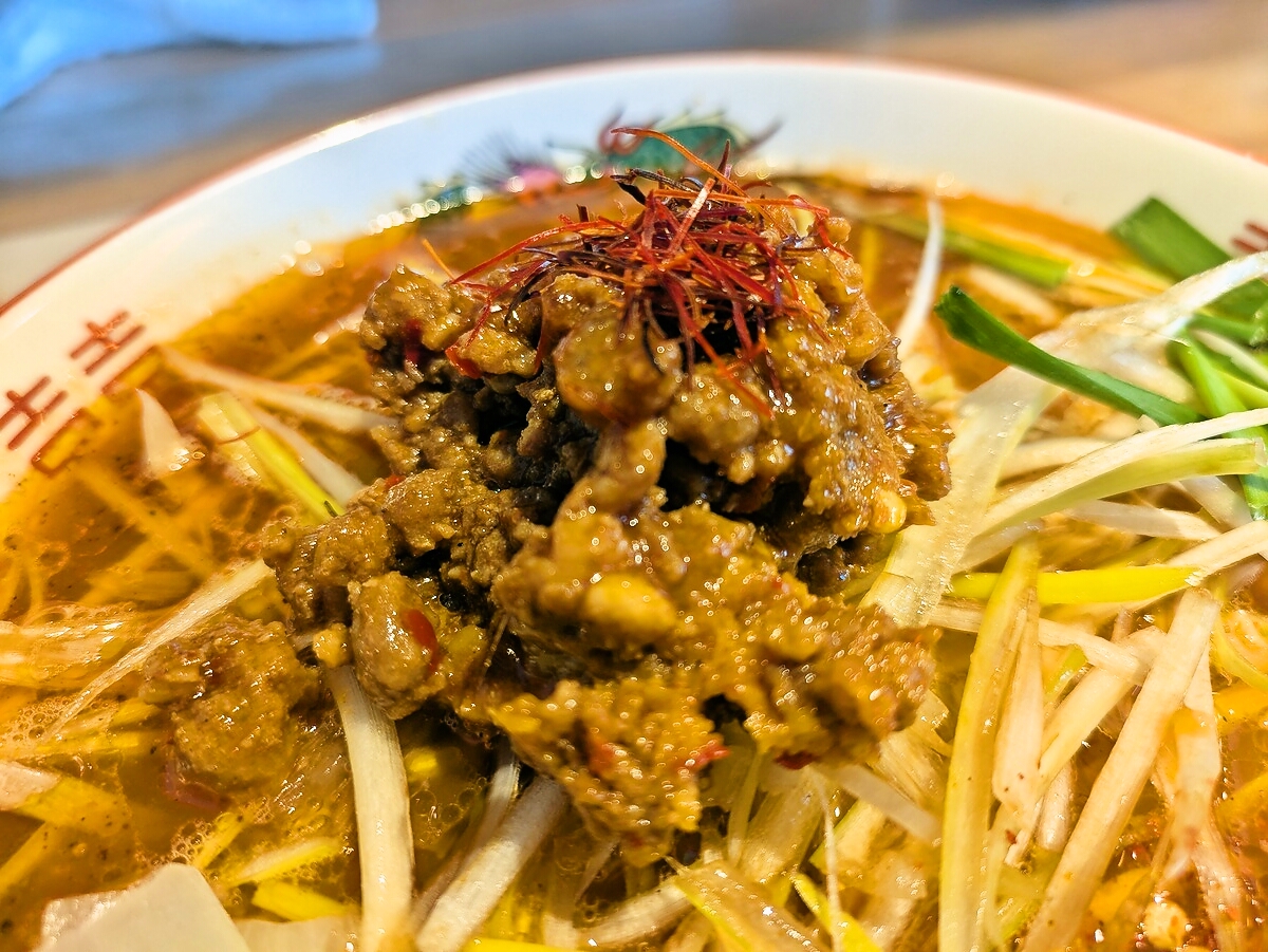 具材には挽肉、刻みネギ、玉ねぎのスライス、糸唐辛子がトッピングされ、視覚的にも食欲をそそる