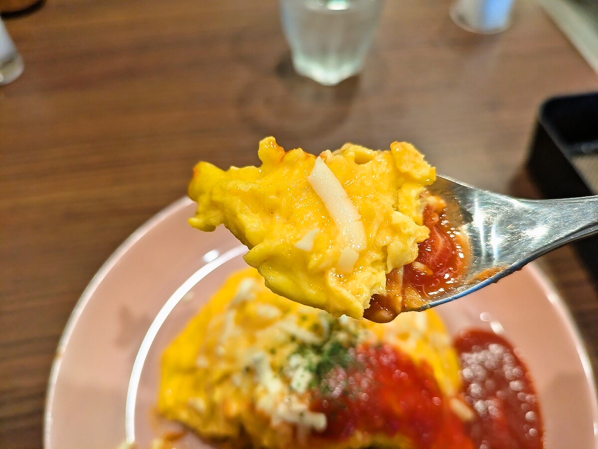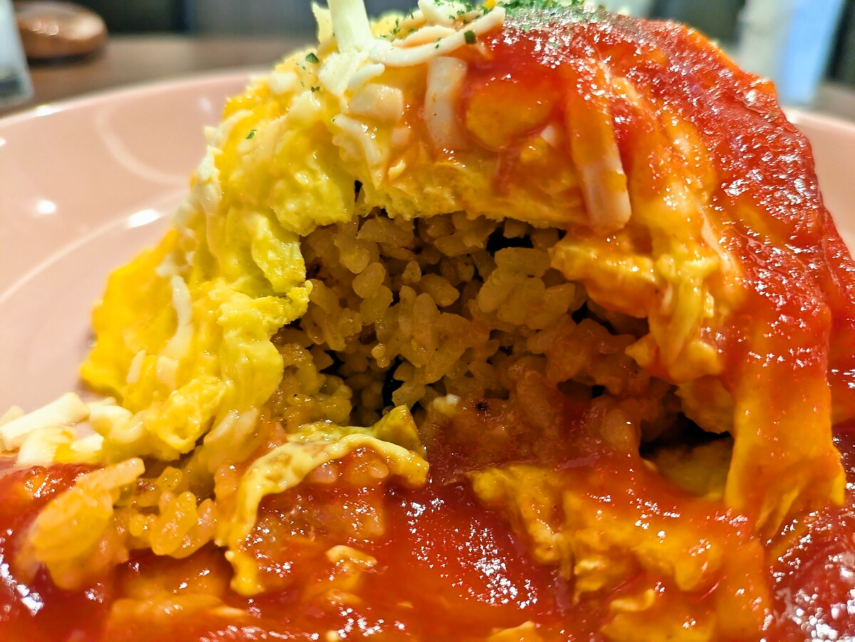 スプーンを入れると、卵の下からチキンライスが湯気を上げて顔を出し、トマトの酸味とチーズの香ばしさが立ち上る