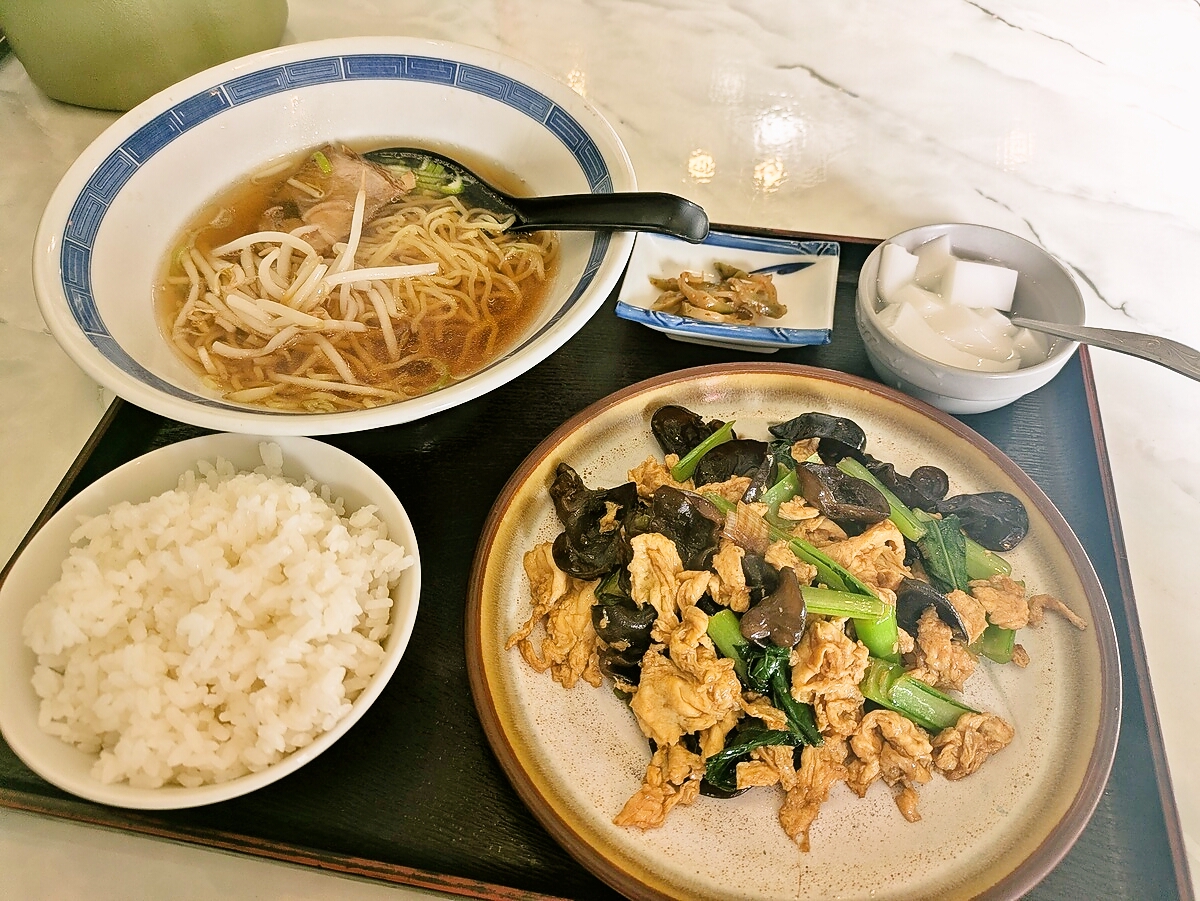 「キクラゲと玉子炒め」日替りランチは、メインの炒め物、ハーフ麺、ライス、ザーサイ、杏仁豆腐と、これ以上ないほどの完璧な布陣だ