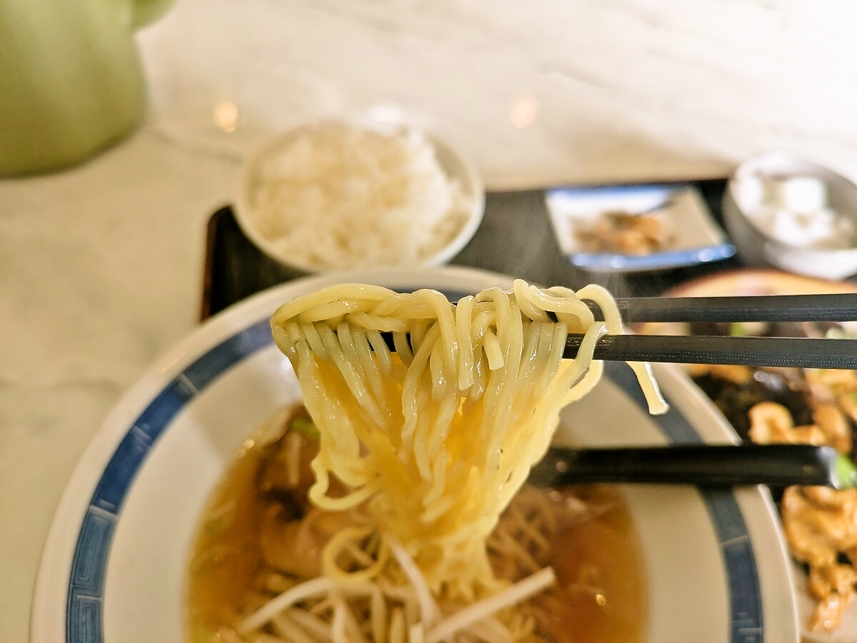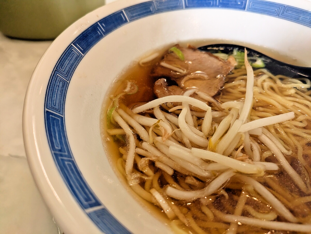 細麺がスープに絡み、チャーシューやもやしのトッピングがアクセントを加える