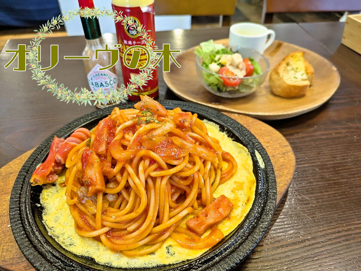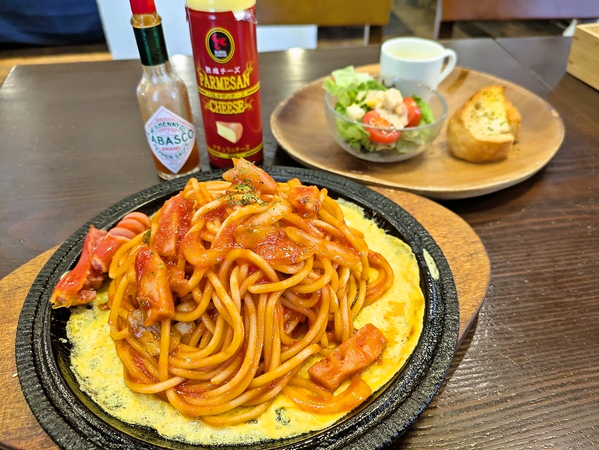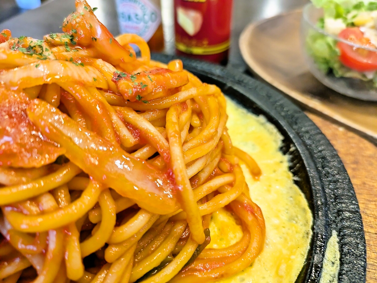 鉄板の上に広がるナポリタンは、トマトケチャップの赤みが鮮やかでワクワク感が止まらない