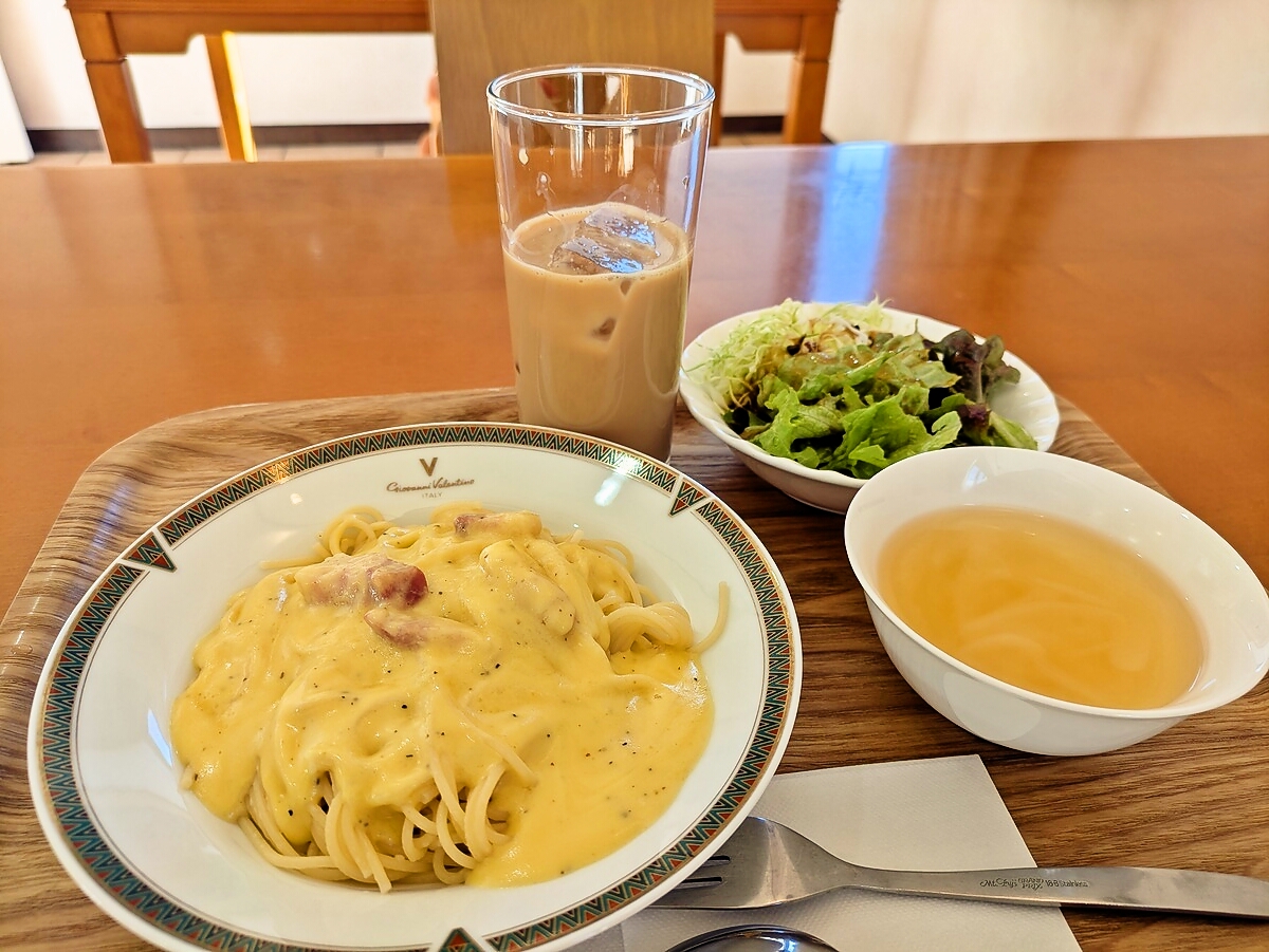 「パンチェッタのカルボナーラソーススパゲティ+アイスカフェオレ(600円)」の配膳