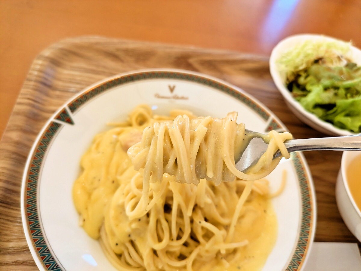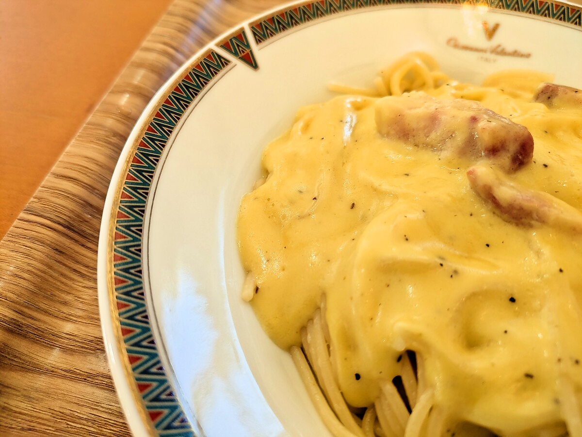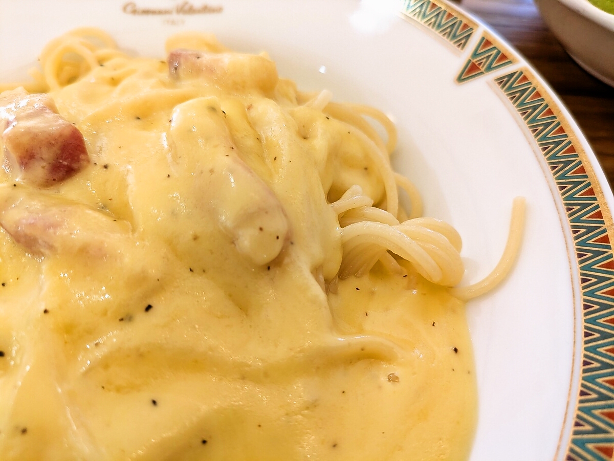 パンチェッタのカルボナーラソーススパゲティは、アルデンテに茹でられたパスタにクリーミーなソースが絡み、卵黄のまろやかな味わいが際立つ一品