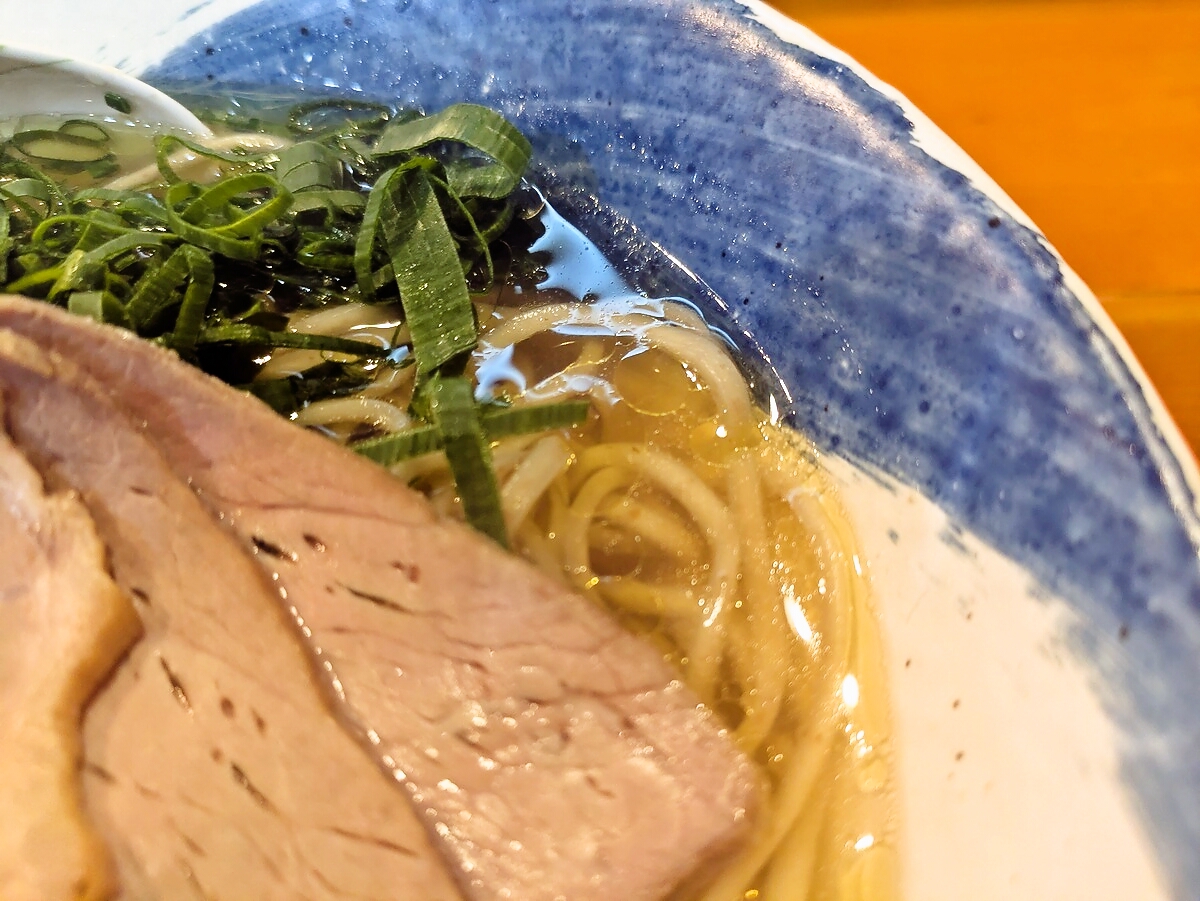 鶏白湯らしいまろやかさと塩のシャープさがバランスよく、クセのある鶏の風味がアクセントになる