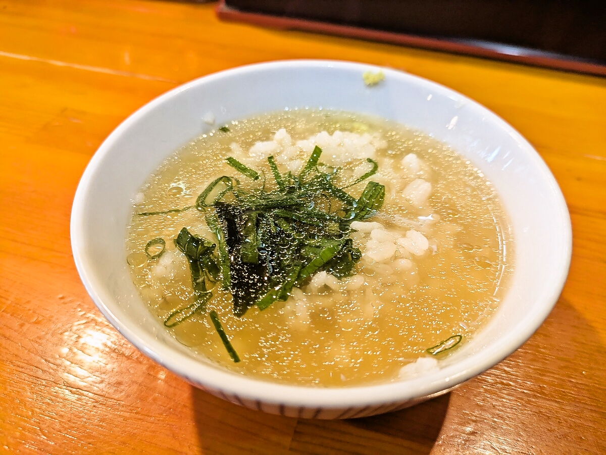 スープの鶏の旨味がご飯に染み込み、わさびのピリッとした辛さがアクセントになってサッパリ締めくくれる