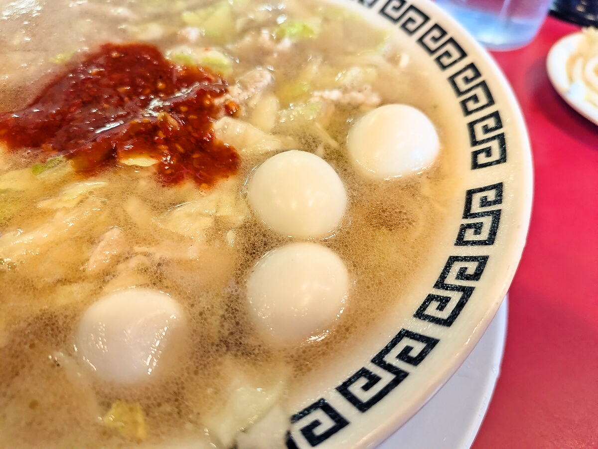 「岐阜タンメン、4辛(880円)」+うずら150円の配膳