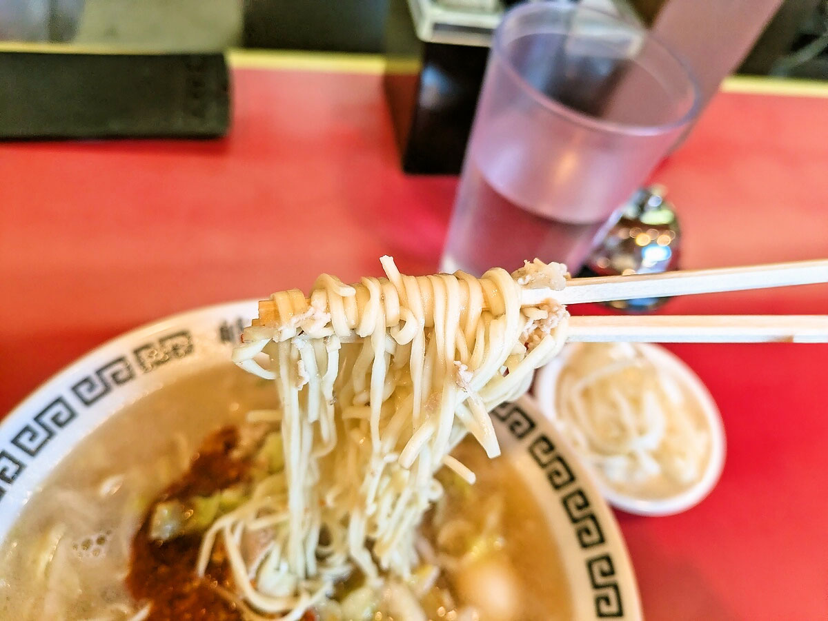 ほどよいコシでスープの持ち上げが良く、辛さをまとってズルズルと箸が止まらない