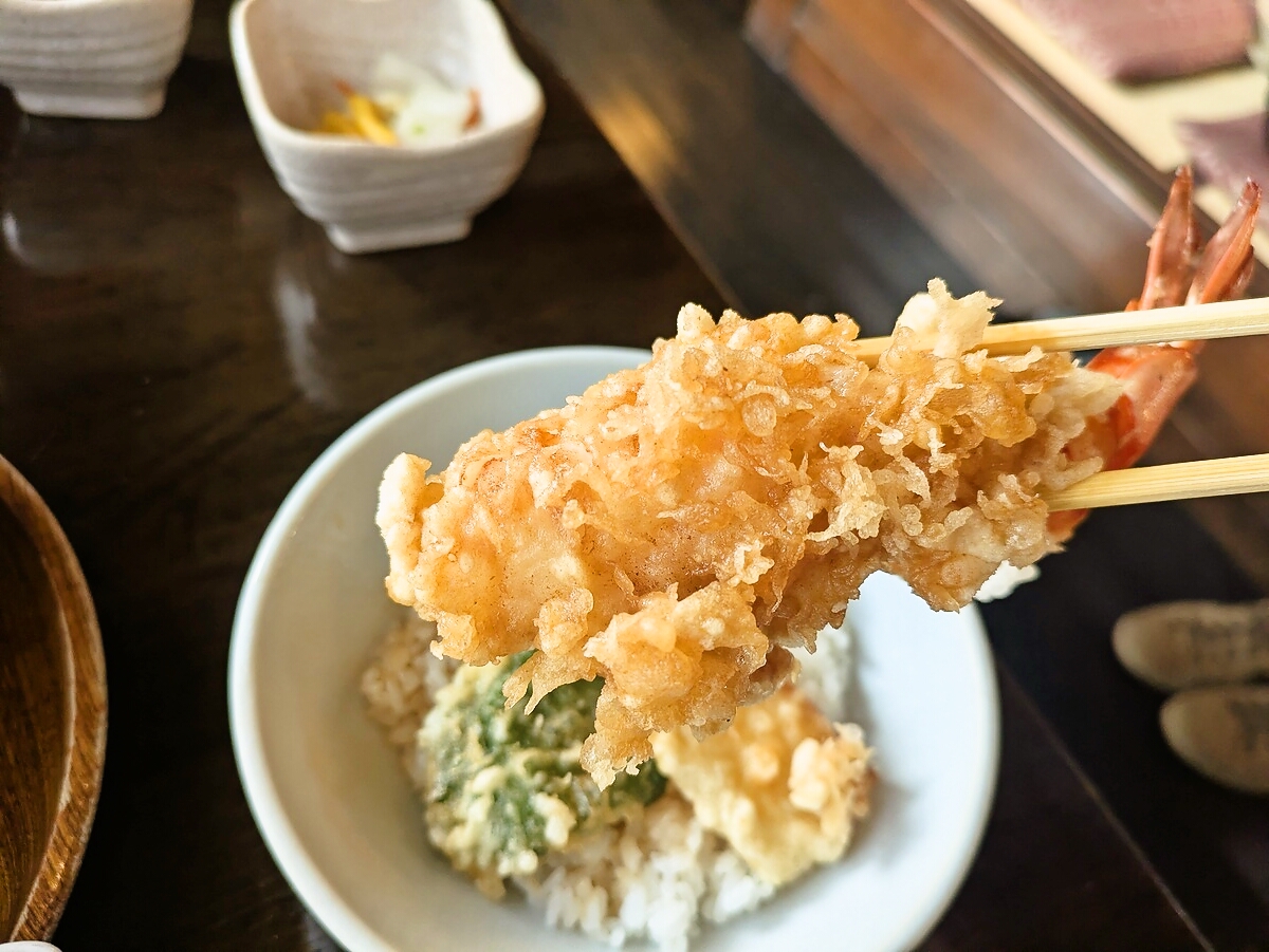 エビはプリプリとした身が詰まっており、衣はサクサクで軽め