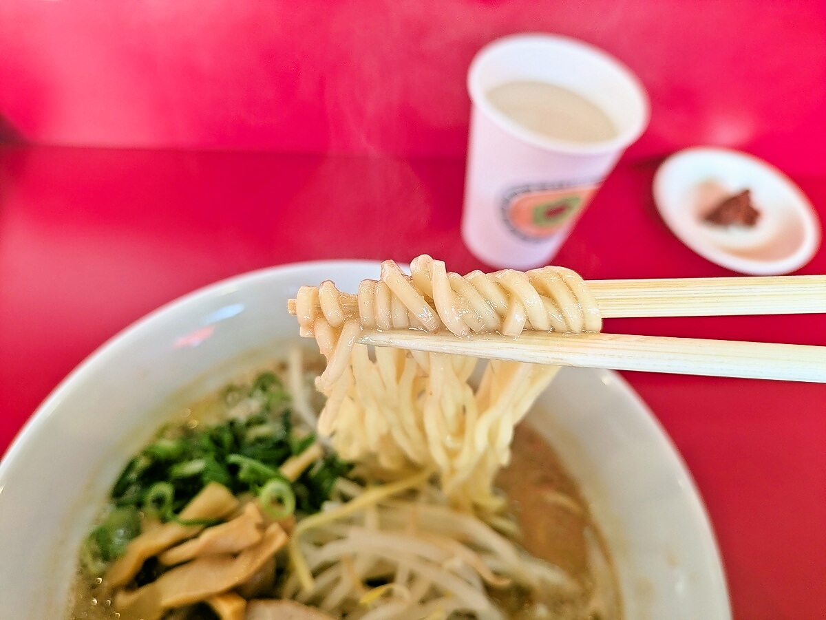 麺は中太のストレート麺で、スープがよく絡み、食感もプリプリ
