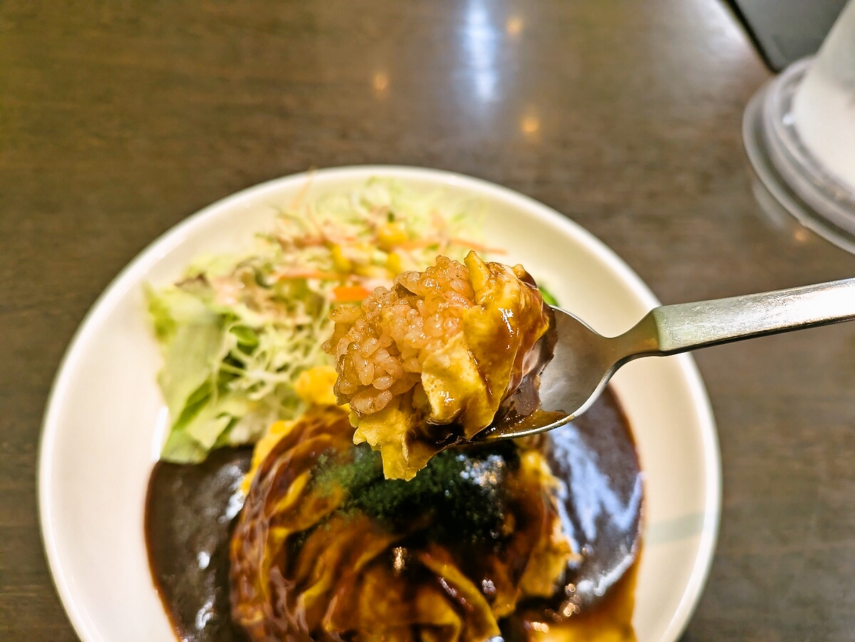 中のケチャップライスと卵、そして濃厚なデミグラスが三位一体となり、口の中が幸福感で満たされる