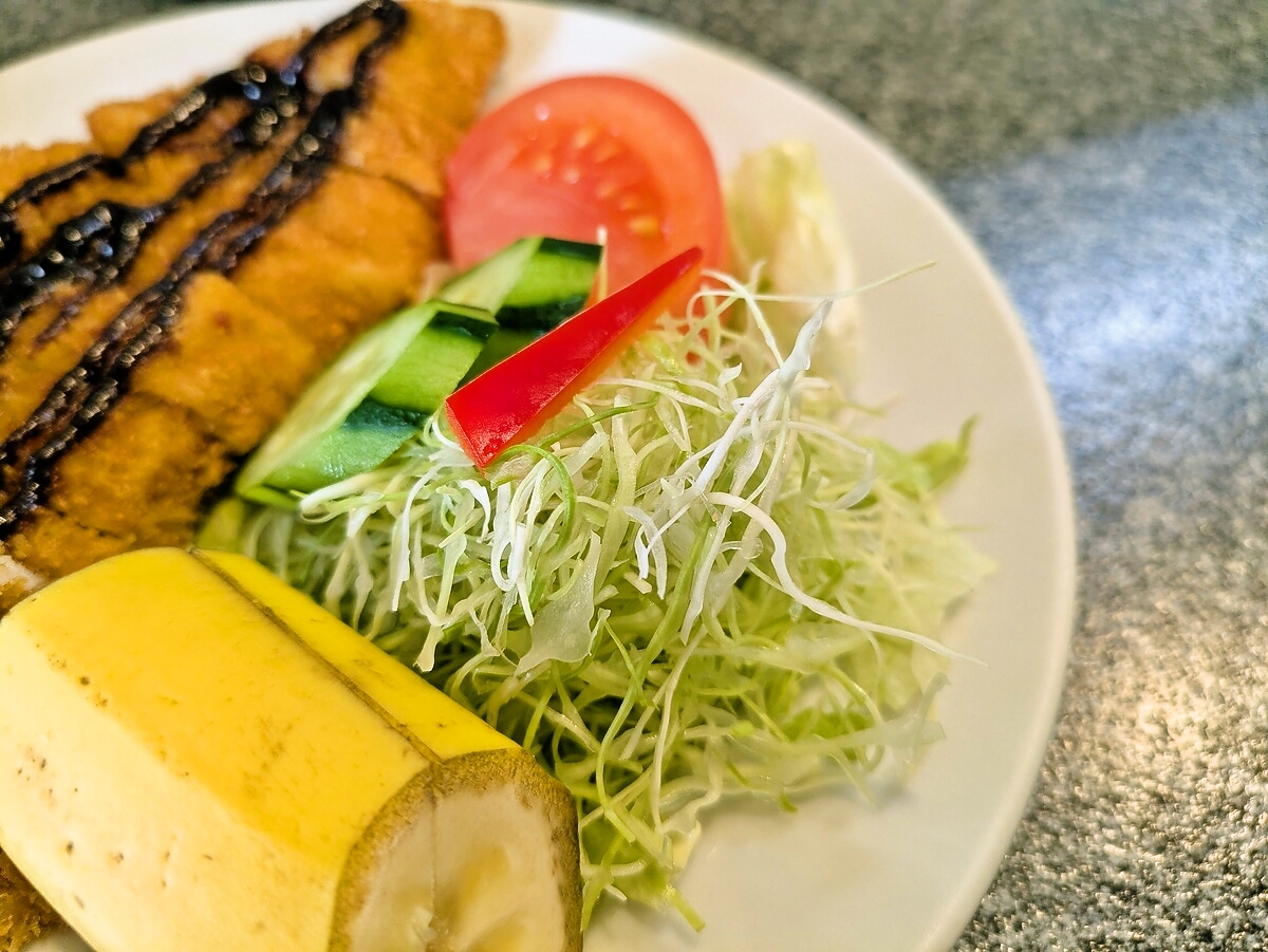 かつの横には同じ皿にサラダが添えられており、いかにも“昔ながらの食堂定食”といった安心感のある佇まいだ