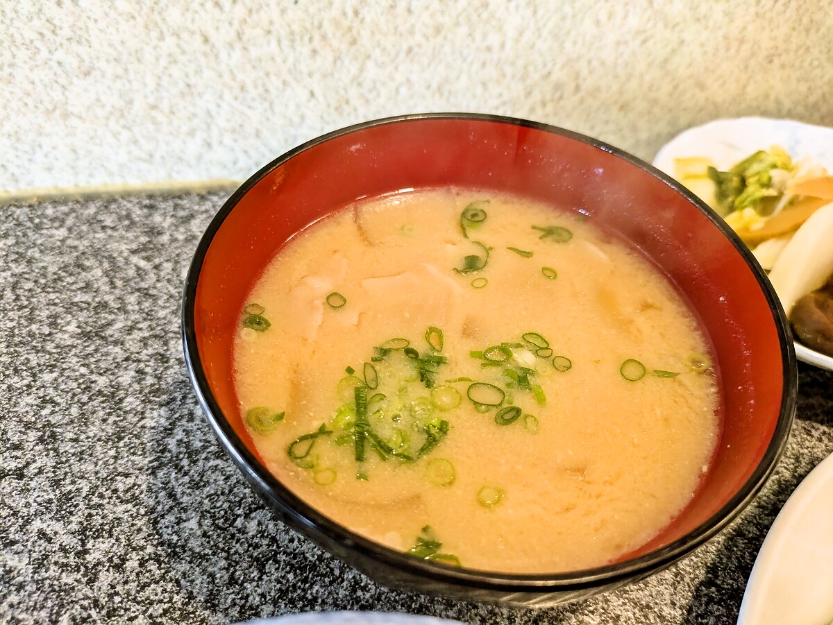 豚汁は具だくさんで、味噌の風味がしっかり効いたほっとする一杯