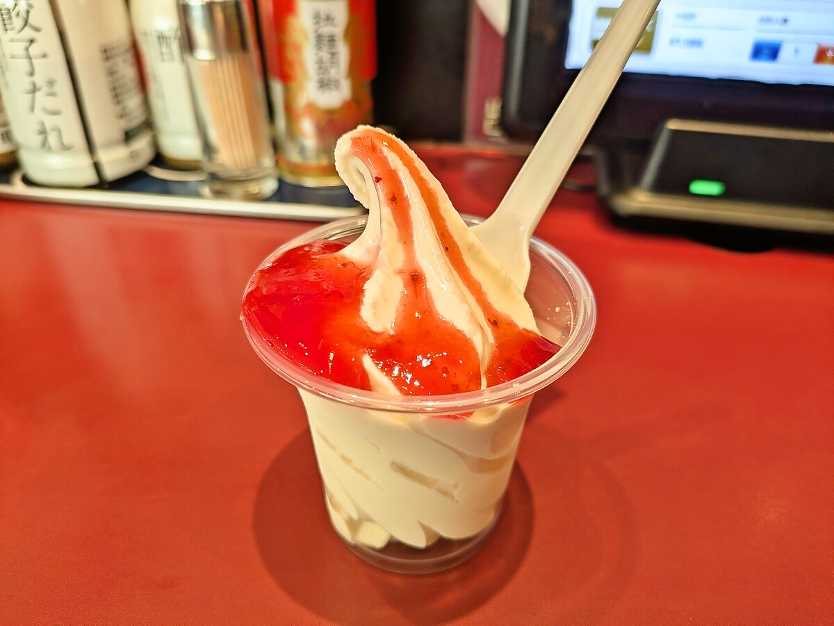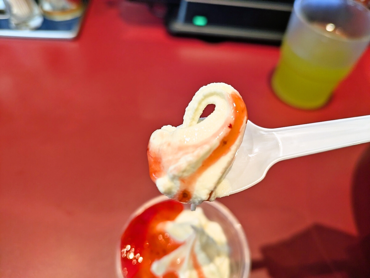いちご味は甘酸っぱい風味が爽やかで、ソフトクリームのクリーミーさが辛さをリセットしてくれる